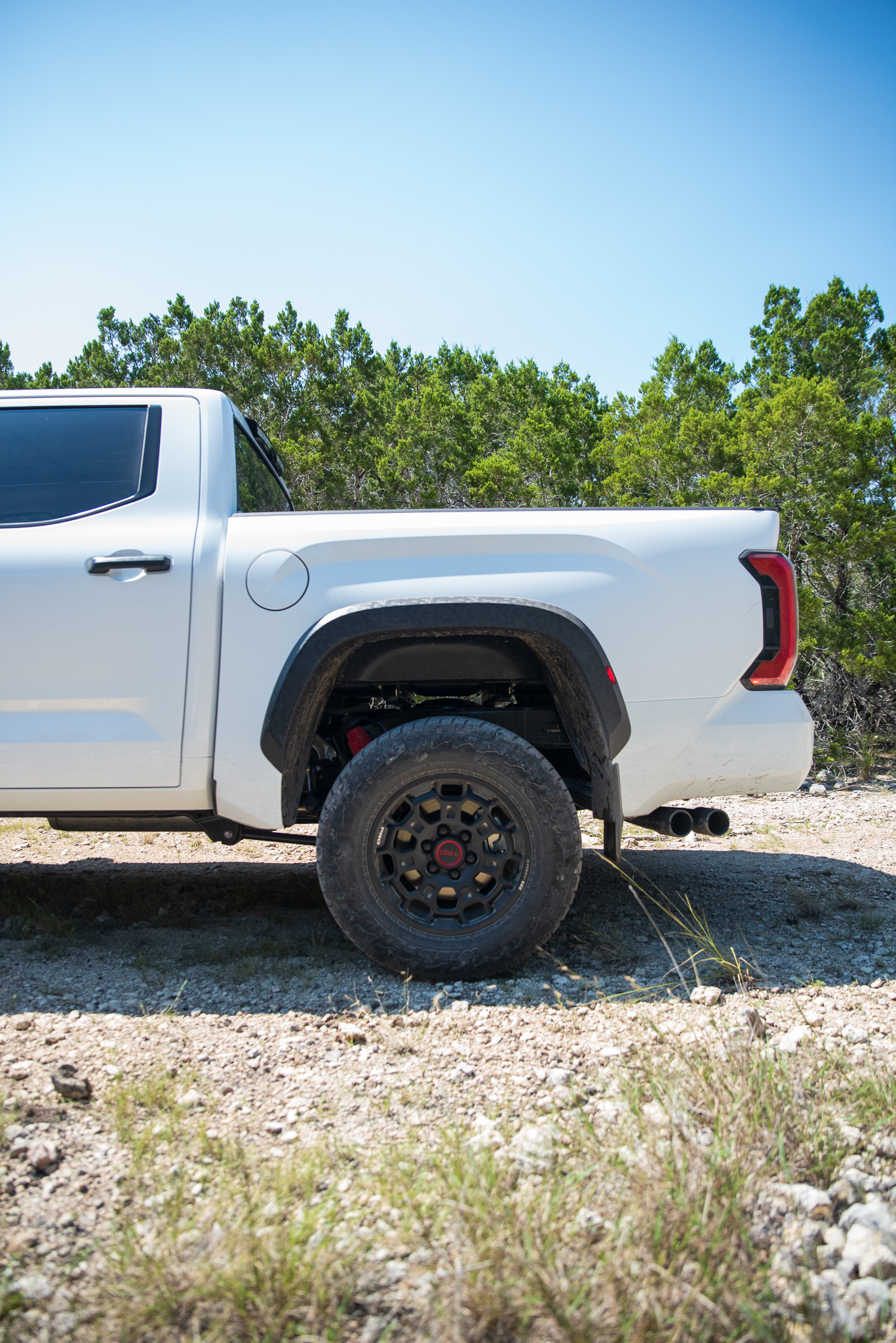 The suspension, as any wise four-wheeler will tell you, is crucial when the going gets rough and rocky. And just as the 2022 Tundra’s five-link, coil spring rear suspension brings about comfort and towing improvements, it also lends itself to better trail performance. Articulation was plenty impressive when driving through purposely dug pits on the trail Toyota put us journalists on, and I nabbed these shots as proof:
