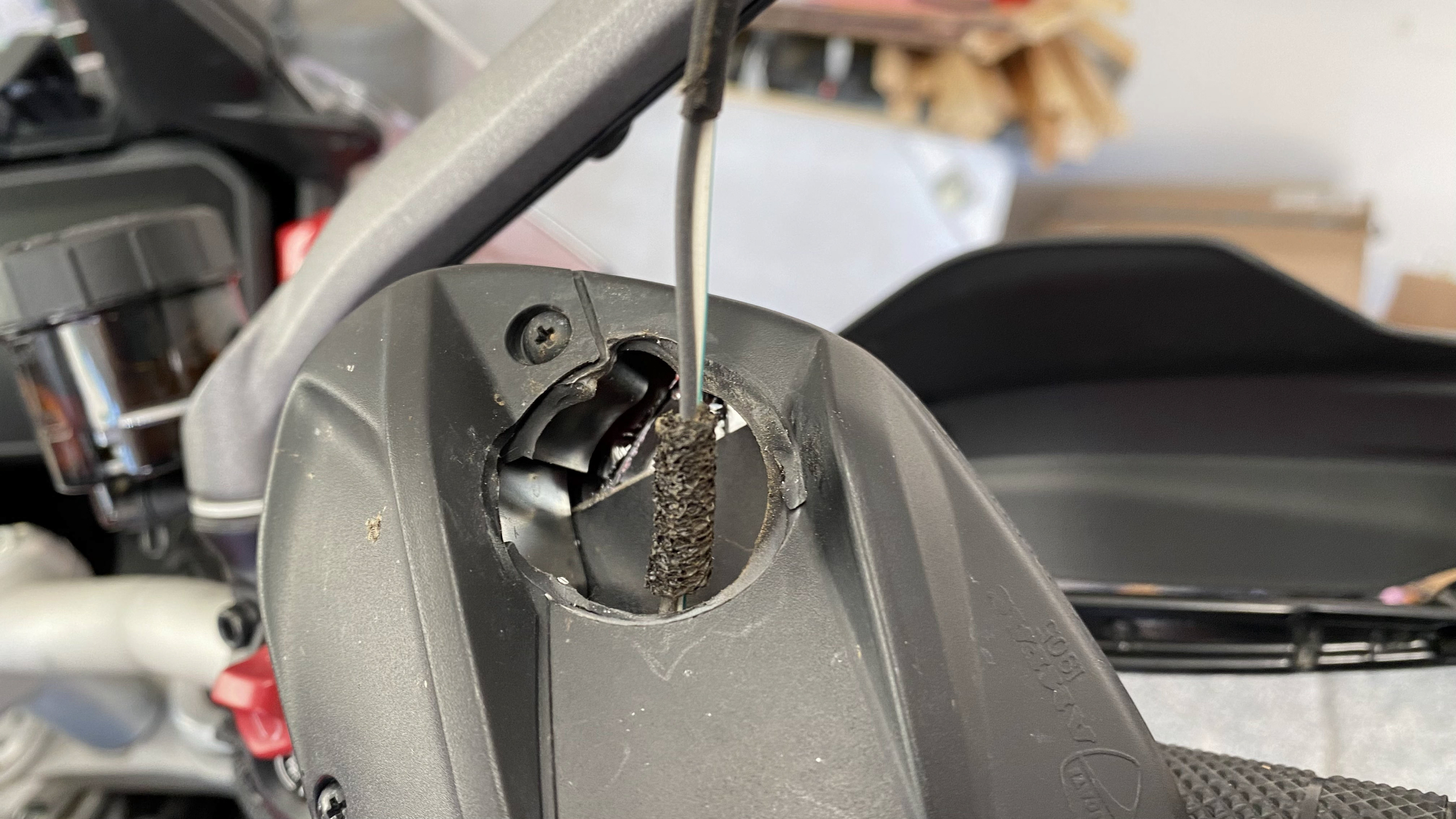 I found this out due to both my own clumsiness and that of my father-in-law’s after I claimed the first mirror just tootling around my property, stalled on a slight incline, and fell over at a whopping one mph. The left mirror snapped nearly in half. And then, a few days later, with the first mirror duct-taped together, my father-in-law attempted to move the Ducati in my garage and dropped it onto the side of my Volvo XC90, breaking the right side mirror.