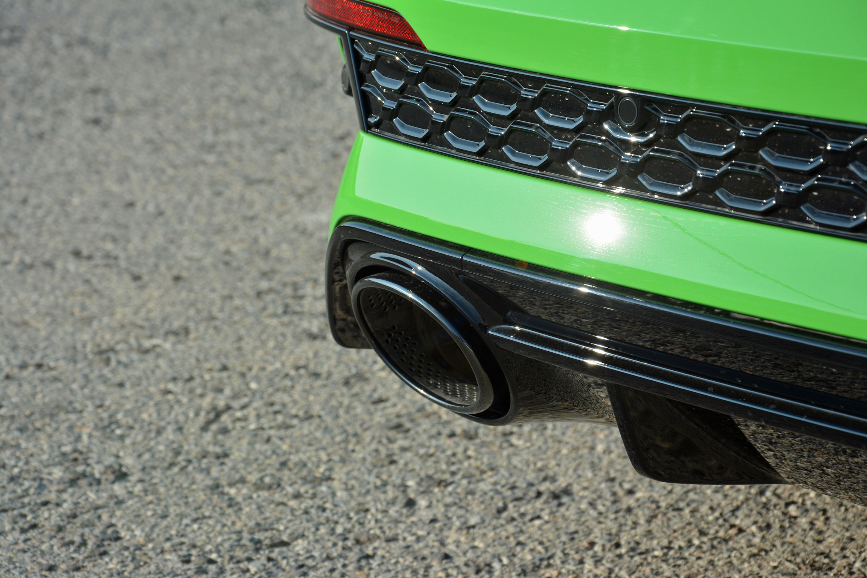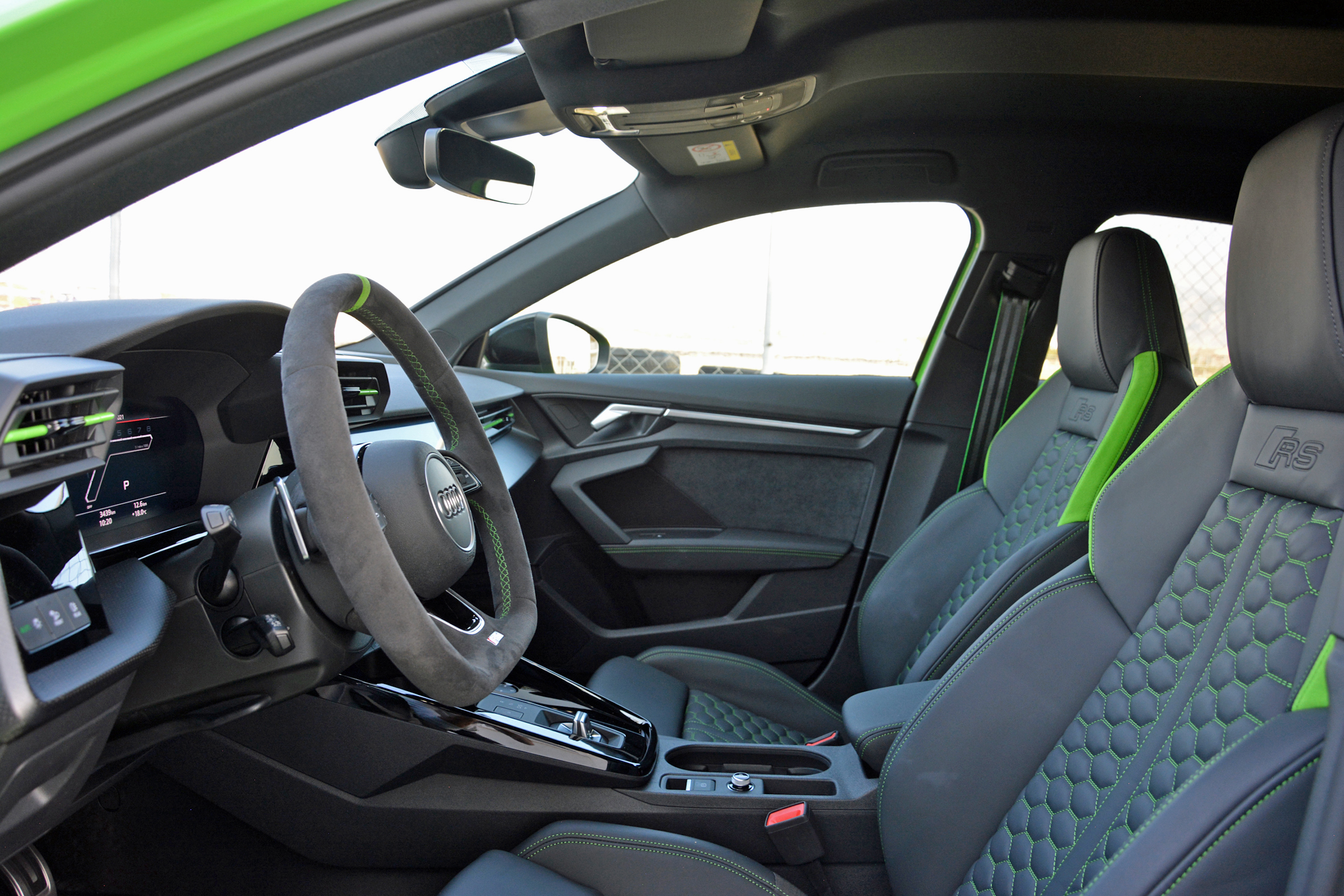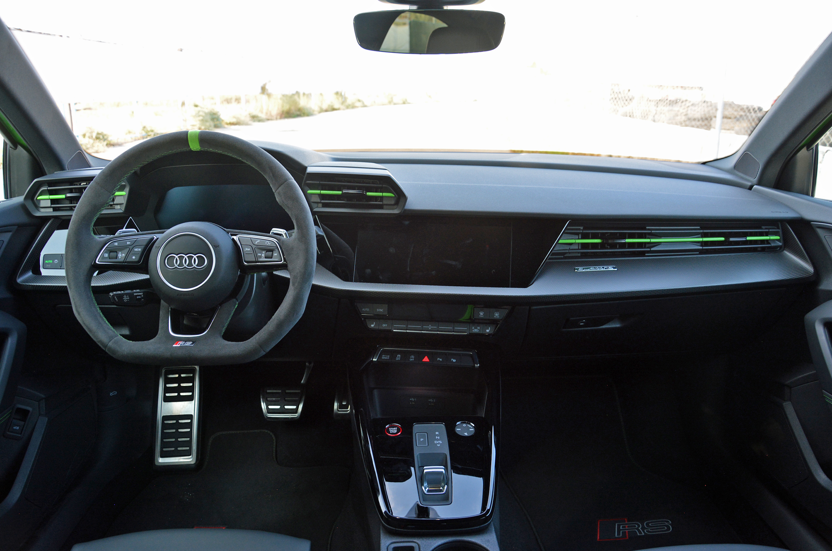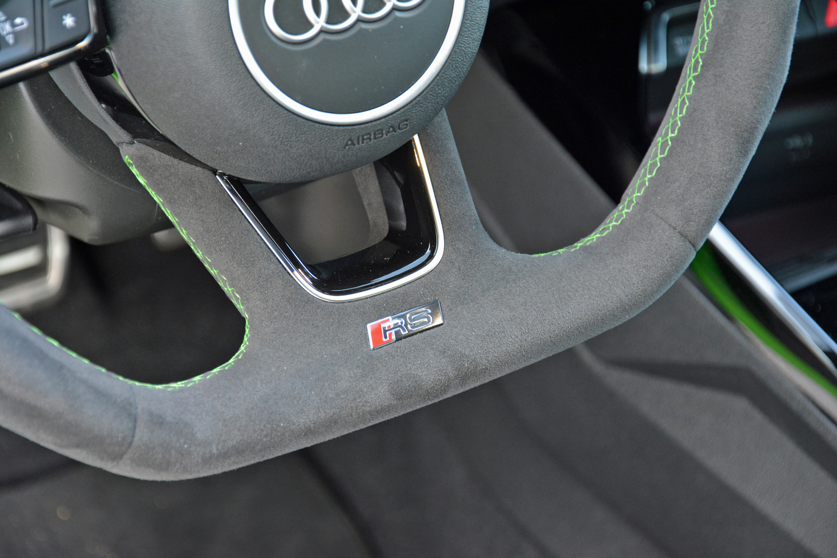 On the open road, the RS3 makes a good first impression. It’s quick, both off the line and when passing, and the suspension system is more compliant than you might expect considering its performance credentials. It’s also very mature: you don’t hear snaps, crackles, and pops from the exhaust system. That’s partially due to European noise regulations, which tend to be stricter than America’s, and I’m told the version that will disembark here will bark at least a little louder thanks to exhaust flap-related tweaks. That’s great news: the five-cylinder’s song is unique and worth cranking up. As it stands, however, the loudest part of the test car I drove is the green paint (more subtle colors will be available, too).