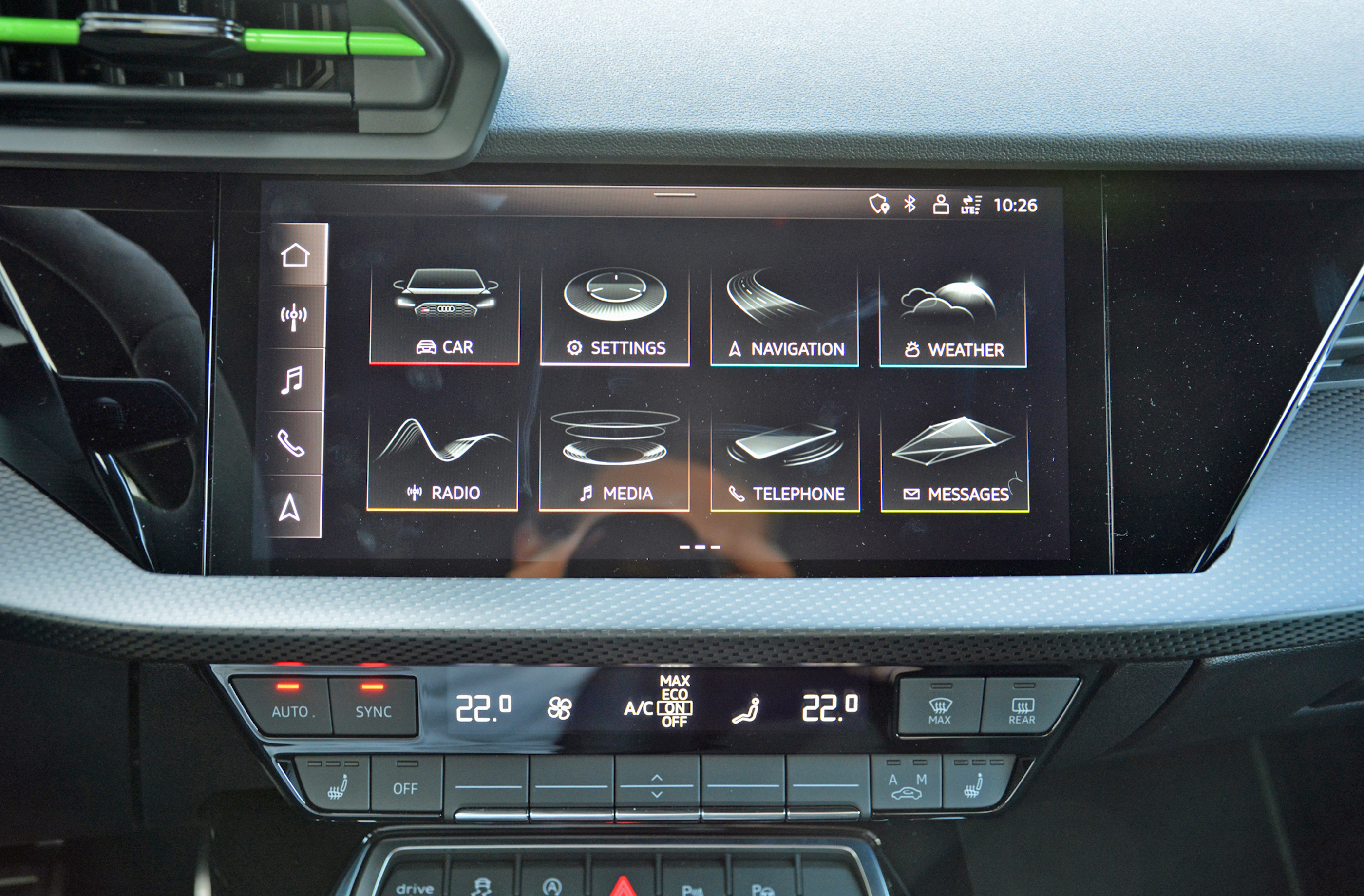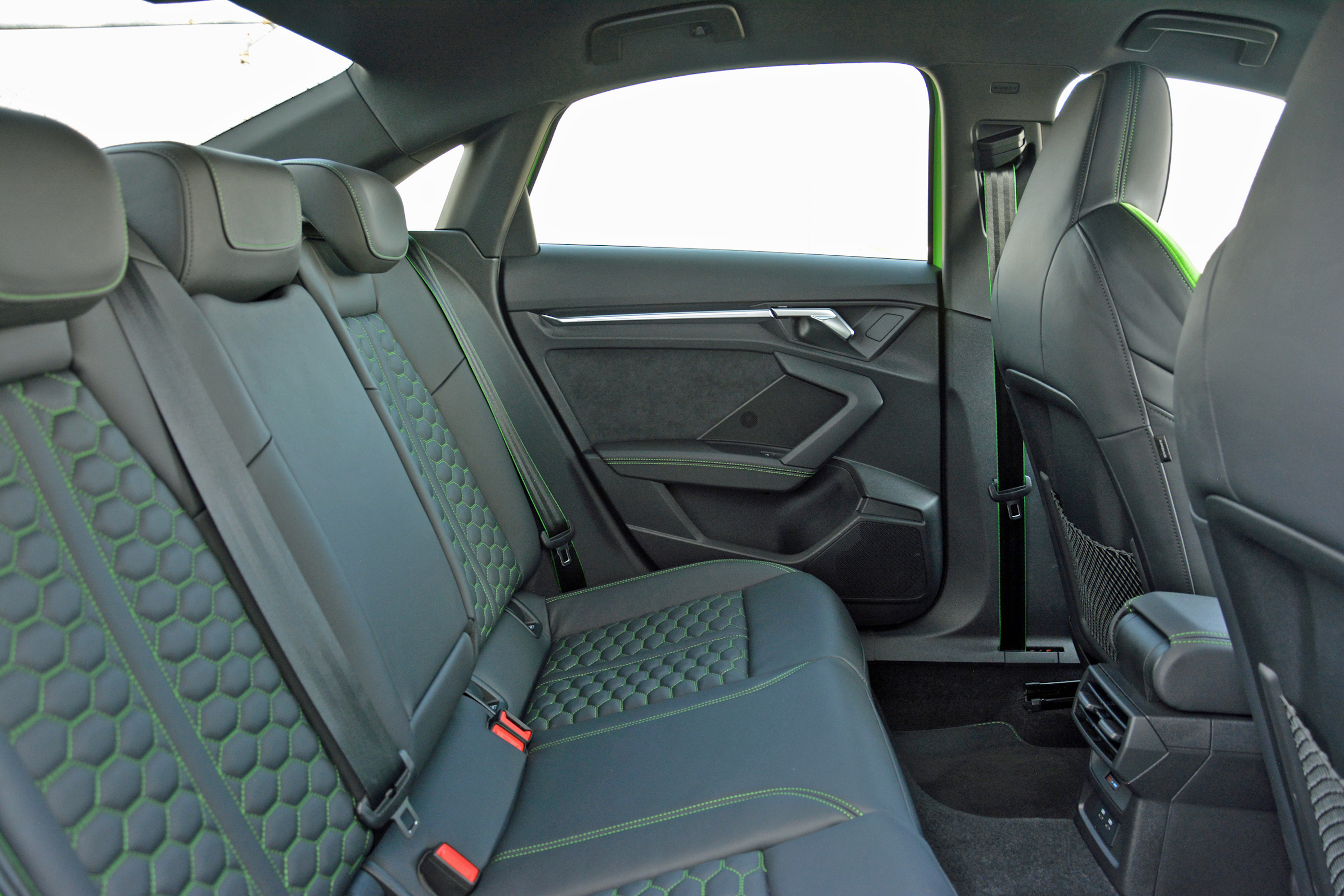 James Gilboy praised the build quality and the materials used in the 2022 A3, and the RS3 deserves the same ovation. Audi paid a tremendous amount of attention to details. It also added several RS-specific ingredients like well-bolstered sport seats for the front passengers, a 12 o’clock mark on the steering wheel, and a new available layout for the Virtual Cockpit digital instrument cluster. Look to your right, and you’ll spot the familiar 10.1-inch touchscreen that displays an intuitive infotainment system. There’s a ton of tech, but it’s neatly integrated into the cabin so it’s not overpowering or overly distracting.