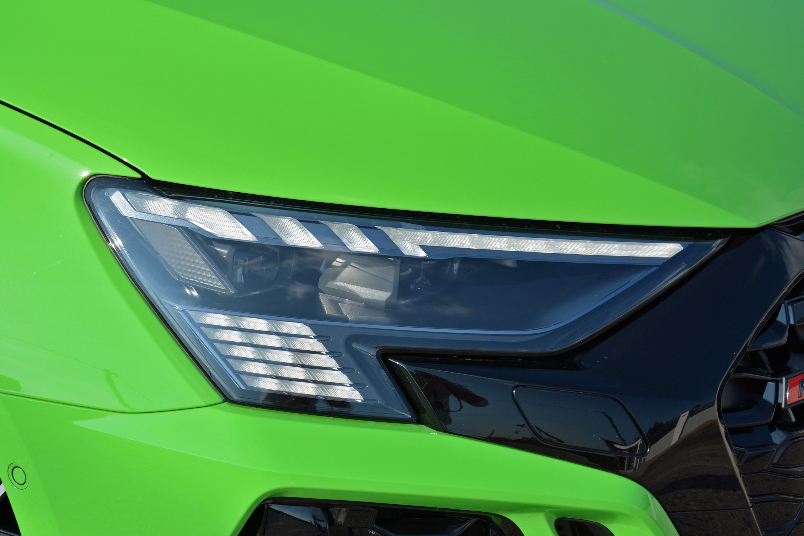 Based on the fourth-generation A3, the RS3 is new for the 2022 model year. Visually, it’s characterized by an exterior design that’s far less subtle than its predecessor’s; there’s no mistaking it for an S3 when you see it in your rear-view mirror. Designers notably added rhombus-shaped inserts that echo the Audi Sport logo to the grille and they painted the bezel black. In typical Audi fashion, the headlights get a cool treatment as well: There is a cluster of 15 individual LEDs in each unit that illuminate to form a checkered flag. Unlocking the car triggers a welcome sequence that uses the LEDs in the driver-side light to spell out “RS3” one character at a time.