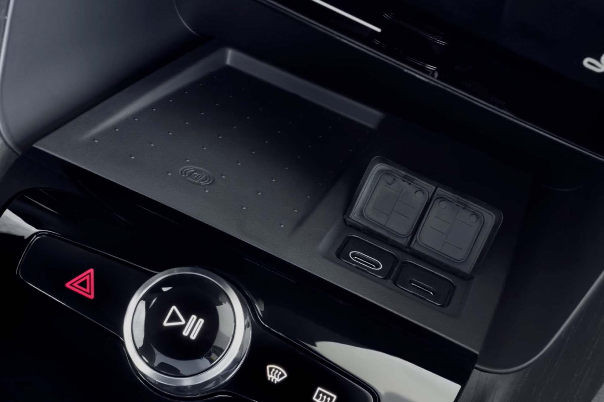 The left half of the compartment is meant for wireless phone charging, while the right half features two USB-C plugs. The problem is, those flaps block off all that space when the ports are in use, so you have even less room.