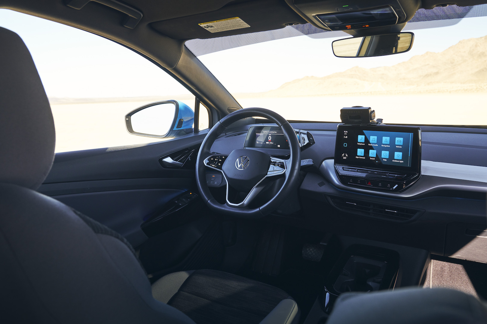 Despite overbearing stability control, jerking the roughly 4,800-pound AWD ID.4 Pro’s wheel sent its rear end into a skid which its 295 horsepower and 339 pound-feet of torque had little trouble maintaining. Because much of that mass is concentrated in the battery beneath the seats, the ID.4 rotated with surprisingly little roll, responded predictably to corrections, and its weight distribution and AWD guaranteed the car went where it was pointed. Understeer loomed large but was easily tamed by the imperceptibly blended regenerative and friction braking, which brought weight back over the front axle.