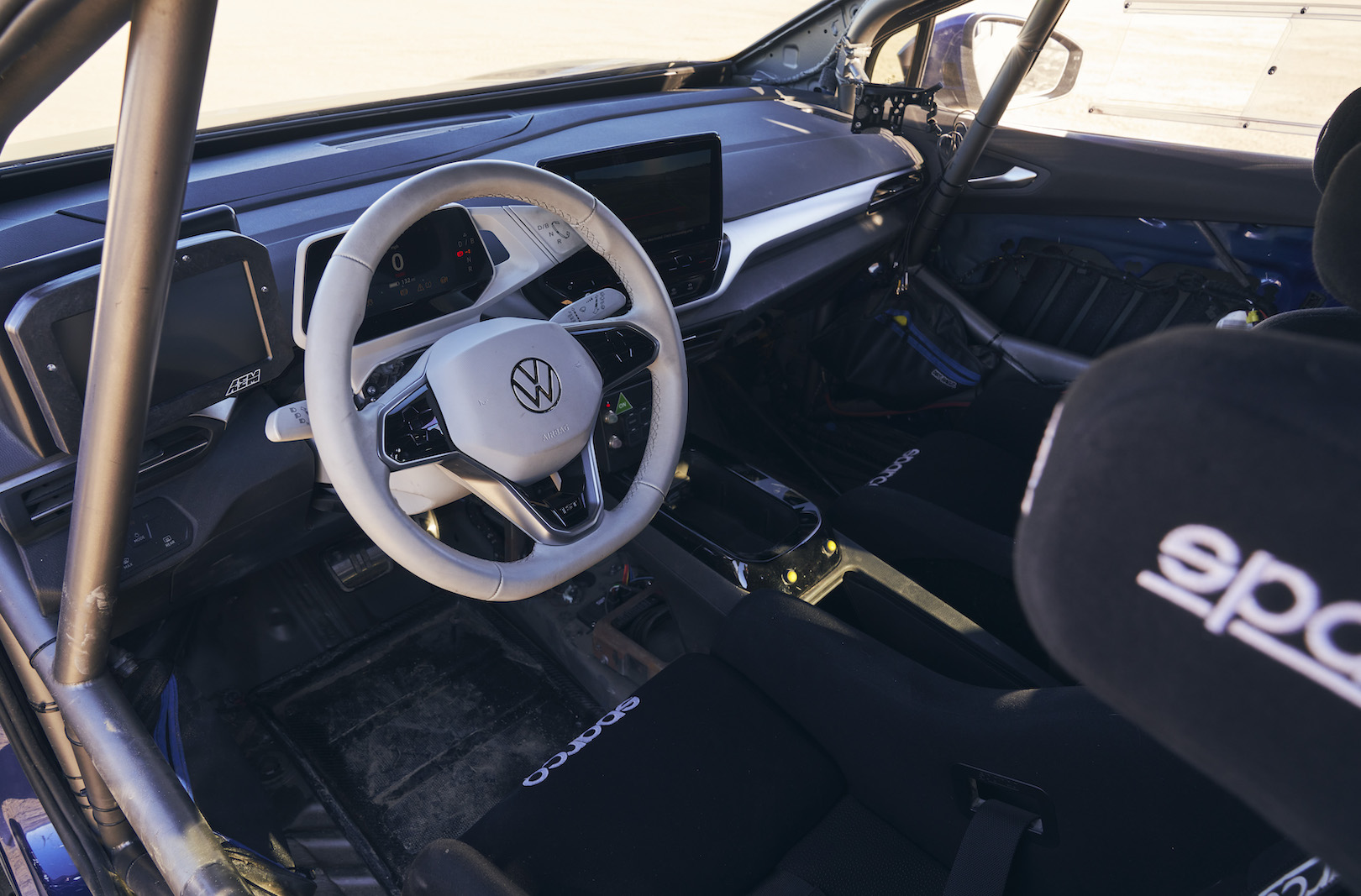 Each rolled on lightweight, 18-inch OZ Racing wheels wrapped in Yokohama Geolandar A/T tires, though the NORRA car’s were slightly larger to increase ground clearance—two more inches of which it gained from rally-style coilovers. The NORRA car was also fully caged and had its air conditioning deleted to save weight. As the Rebelle car wasn’t allowed as extensive a list of modifications, it merely gained an onboard inflation system. But whether modified extensively or modestly, though, I learned on a rallycross course that either are enough to enliven a crossover like the ID.4.