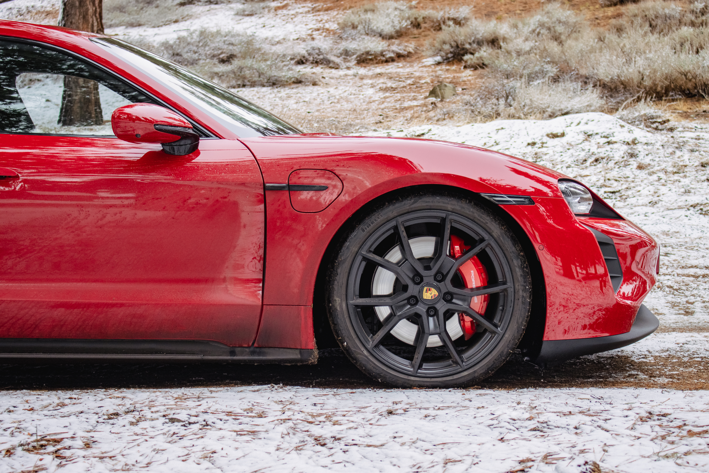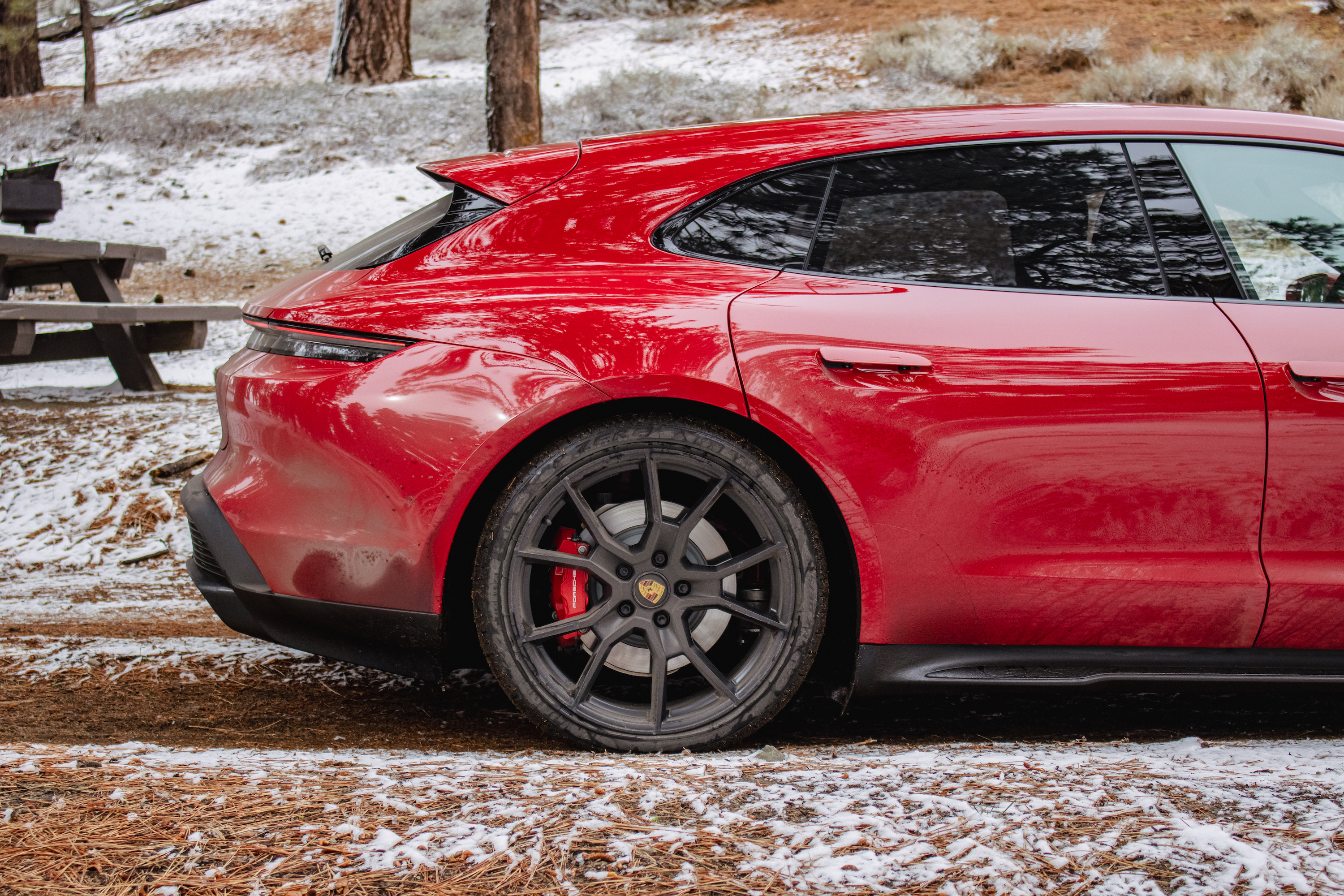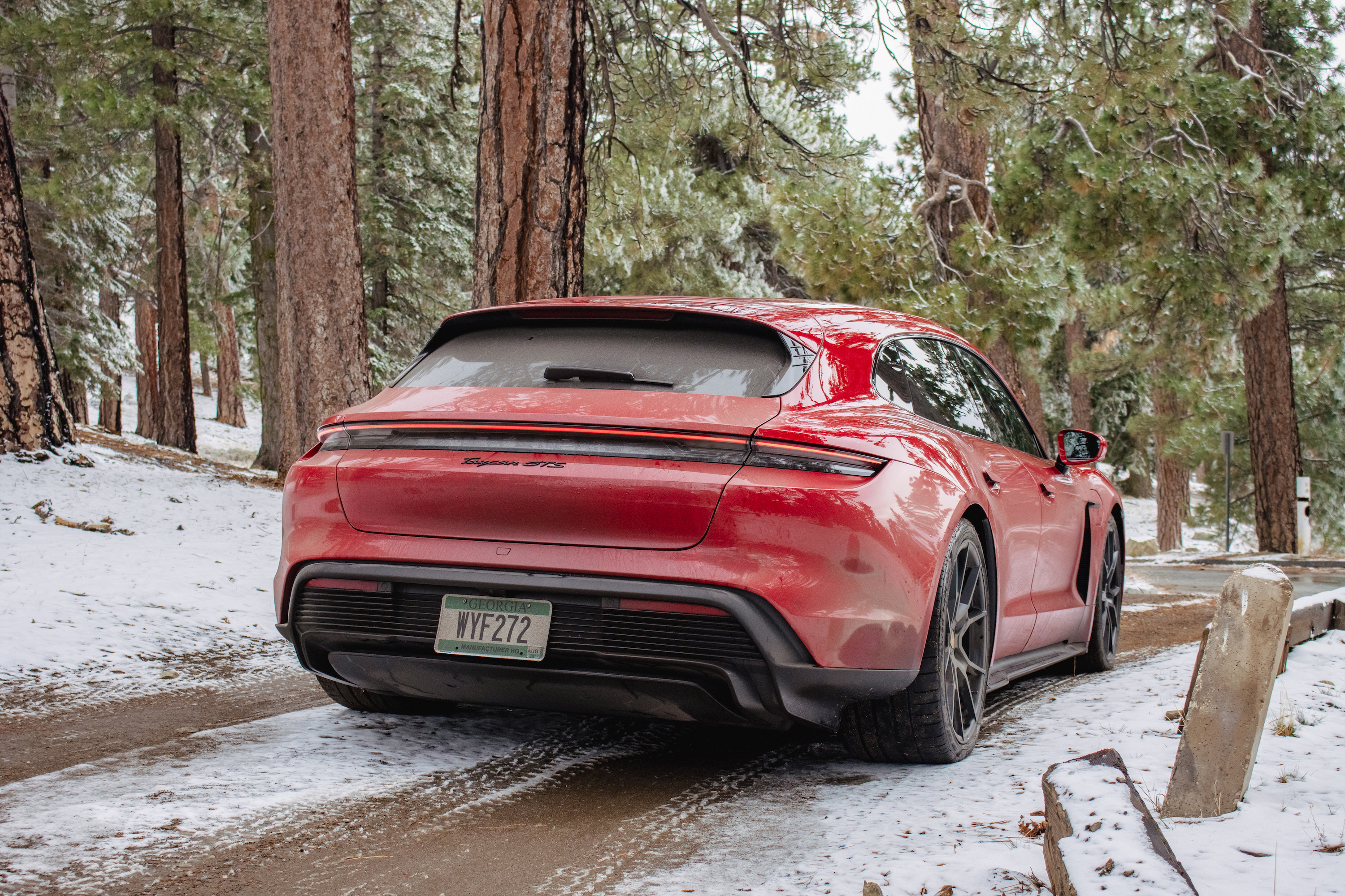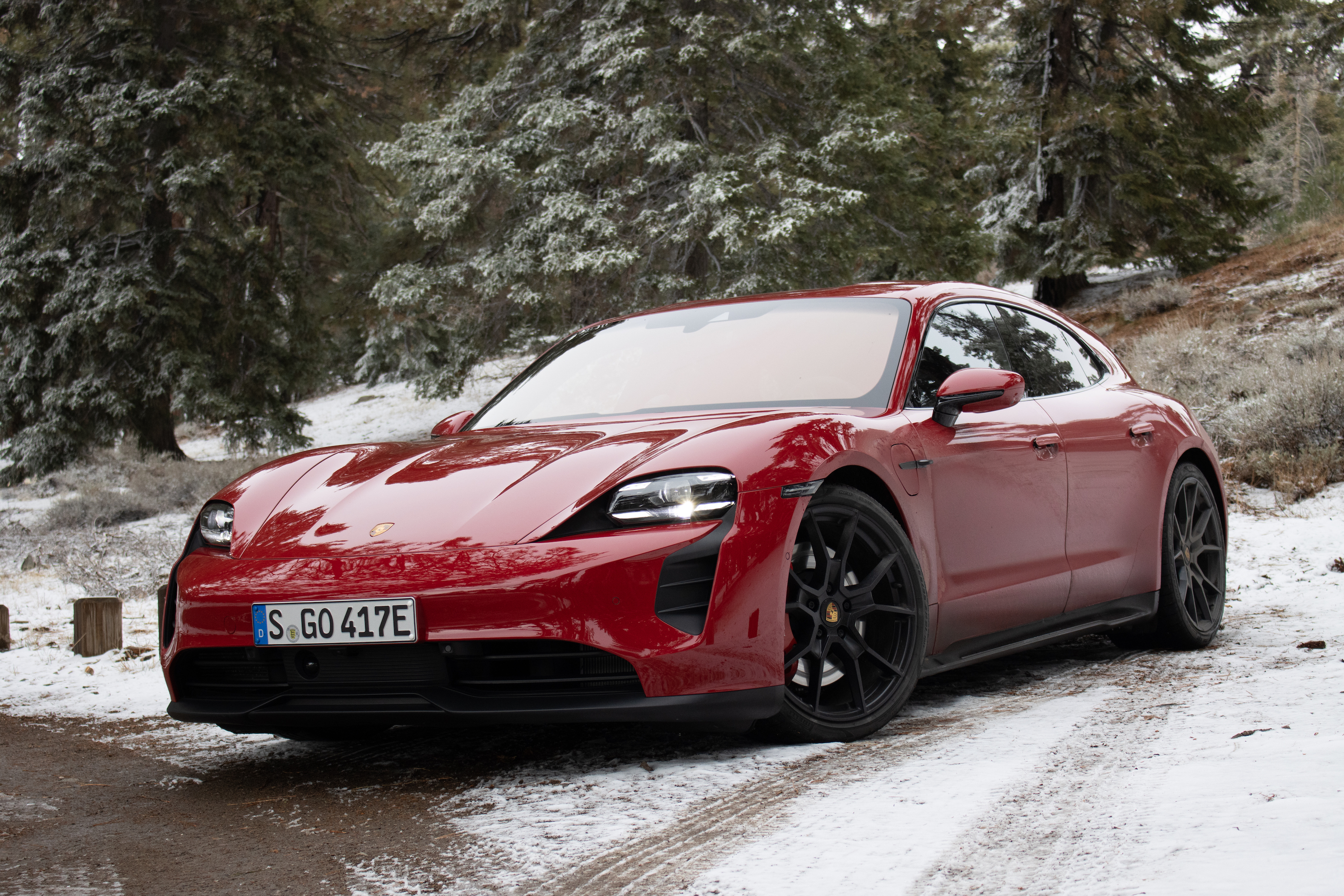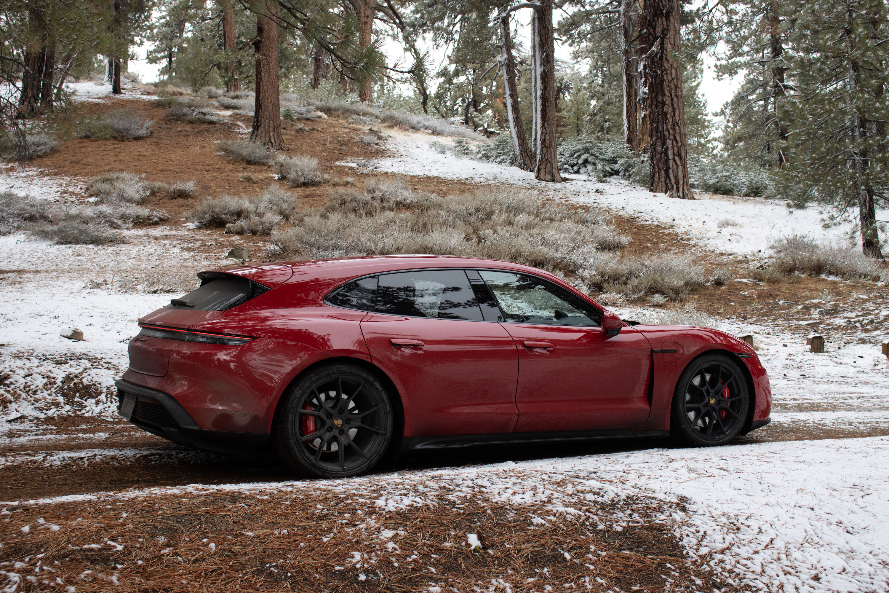 Back to the GTS: the handling is generally neutral with a rear bias thanks to that Turbo-sourced rear-motor. You do get some throttle steer as a result, but it’s also a lot more forgiving towards mid-corner miscues than you might expect. You can lift like an idiot, or brake too hard, or saw at the wheel in a dynamic situation, and it won’t punish you. The sheer balance in everything the Taycan Sport Turismo does cannot be overstated; it danced through corner after corner, devoured straight after straight, and even managed an impromptu trip up a snowy side road (again, on summer tires!) for a photo op. The brakes also deserve a call-out, since Porsche is going its own way here too. A common misconception (much to Porsche’s chagrin) is that the Taycan doesn’t have regen brakes. It does—they’re just fully integrated with the friction brakes. What it doesn’t have is a one-pedal driving mode where they kick in full force as soon as you let off the accelerator. That complex setup could spell disaster for pedal feel, and while they do feel a hair slow to let go when you take your foot off after stomping on it, a tiny bit longer than you would expect if it was just a physical caliper gripping and releasing a rotor, pedal feel overall is just fine, with nicely linear action.