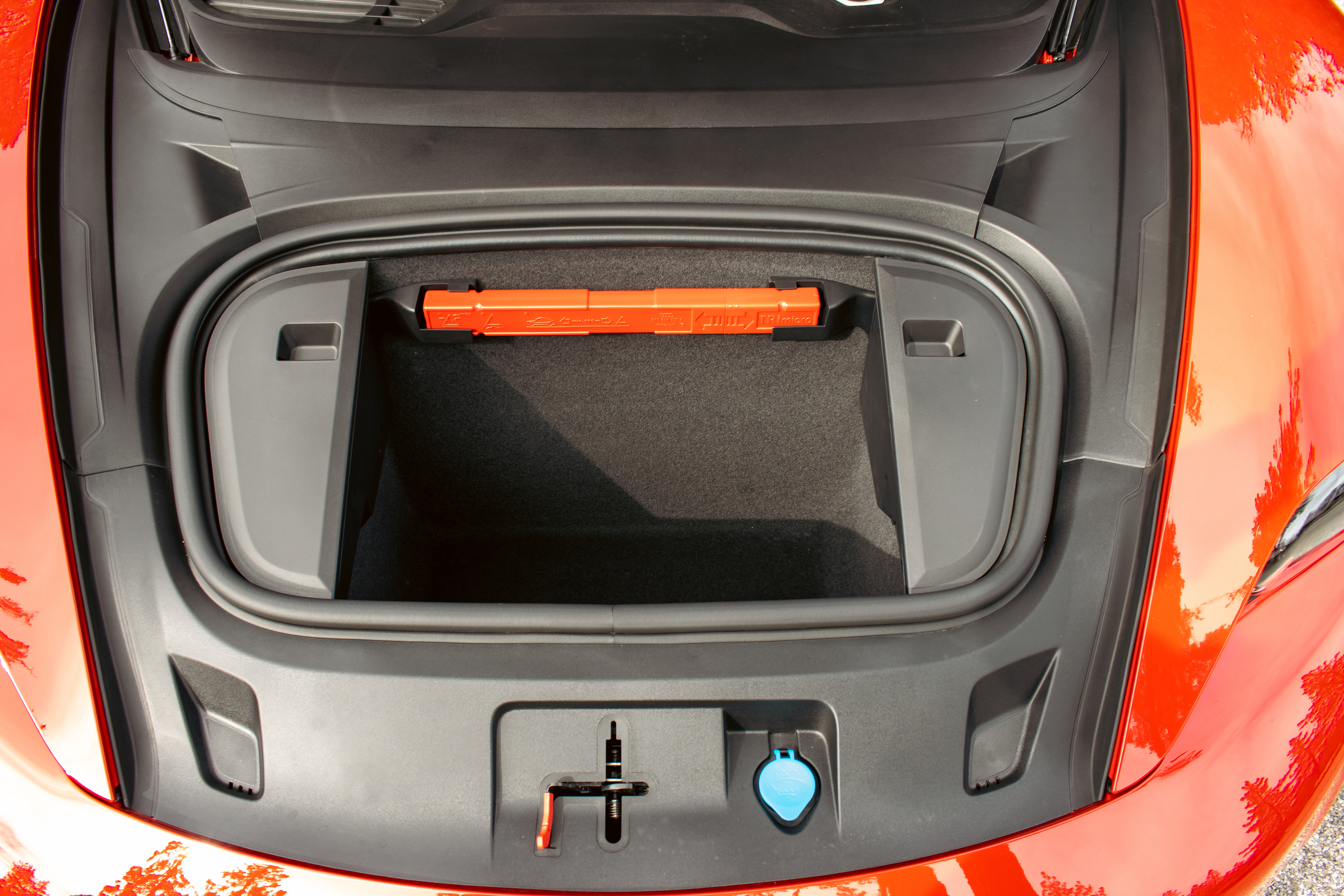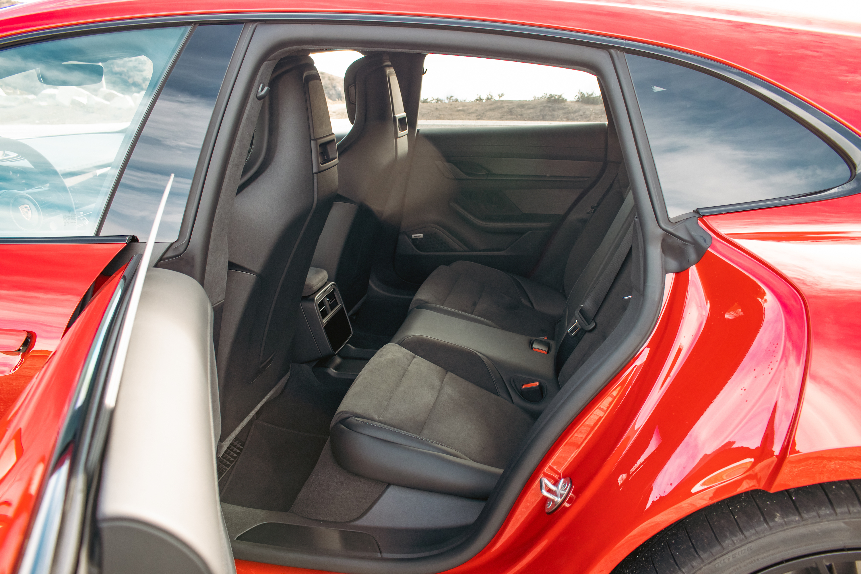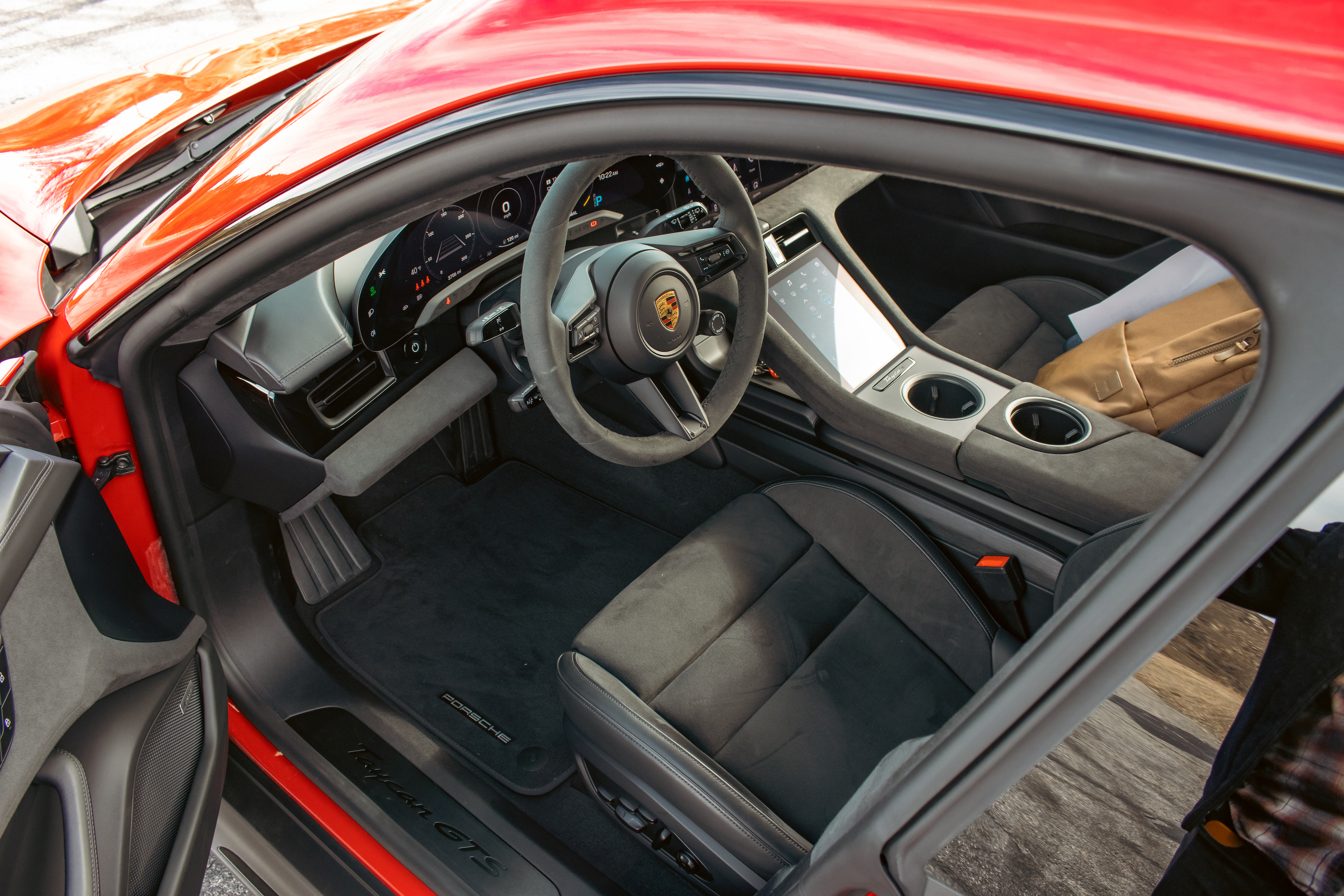 The one place where the Porsche Taycan GTS Sport Turismo doesn’t blow you away is the interior, which is merely fine and leans heavily on the impression that faux suede is for fancy cars. Still, it’s an attractive space, full of straight lines, screens, Wireless Apple CarPlay, and a few ergonomic oddities like rear-seat USB ports located underneath the middle passenger’s knees. The GTS interior has some blacked-out trim bits to match the exterior and “GTS” woven into the headrests, but its real pièce de résistance is the panoramic electrochromic glass roof that’s been sectioned off to dim individually, so you can roll back or slide forward the opaque sections like a physical sunshade, or set them to alternate. This kind of stuff always makes me wonder if it’s going to work in 15 years, but it’s an incredibly cool trick that feels worth the six-figure price.