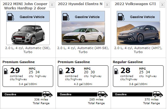 Take, for example, the Hyundai Veloster N. It has more power and is a ton of fun regardless of whichever transmission you choose. Although it does lack the luxury options of the Mini, like heated seats and a heated steering wheel, it starts at $33,545. You can get some of that on the very good Elantra N, though, which starts at just $32,945 and has the same fun engine/transmission as the Veloster, plus heated seats.