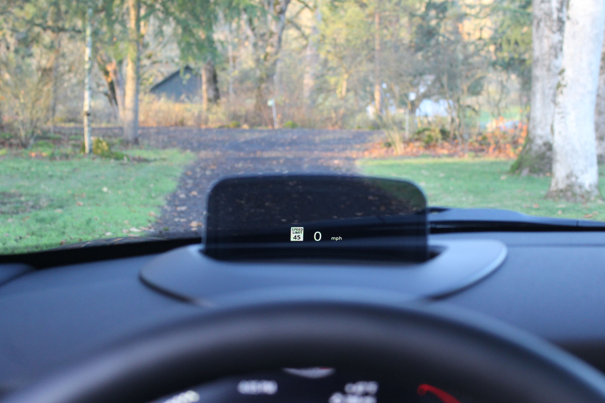 It’s also hard to ignore the car’s massive round digital cluster. It has LEDs integrated into the unusually textured ring around the 8.8-inch display. These seemed to change when I adjusted the HVAC, which sort of made me think they’re a problem searching for a solution. They’re cool, but not great accent lighting—they aren’t really bright or noticeable enough to really affect the mood inside the car. One thing that I did enjoy, similar to the start switch, is the flip-up HUD. When the car starts, it folds into place and displays your current speed and the speed limit right in your peripheral vision.