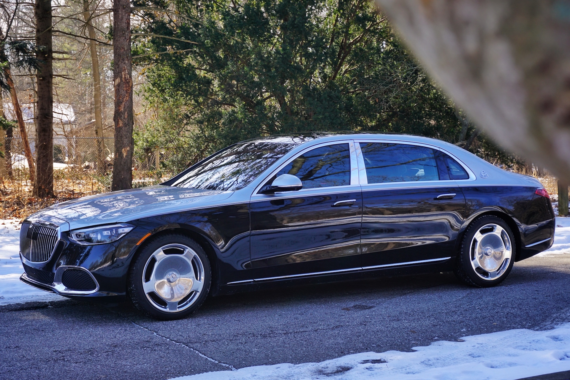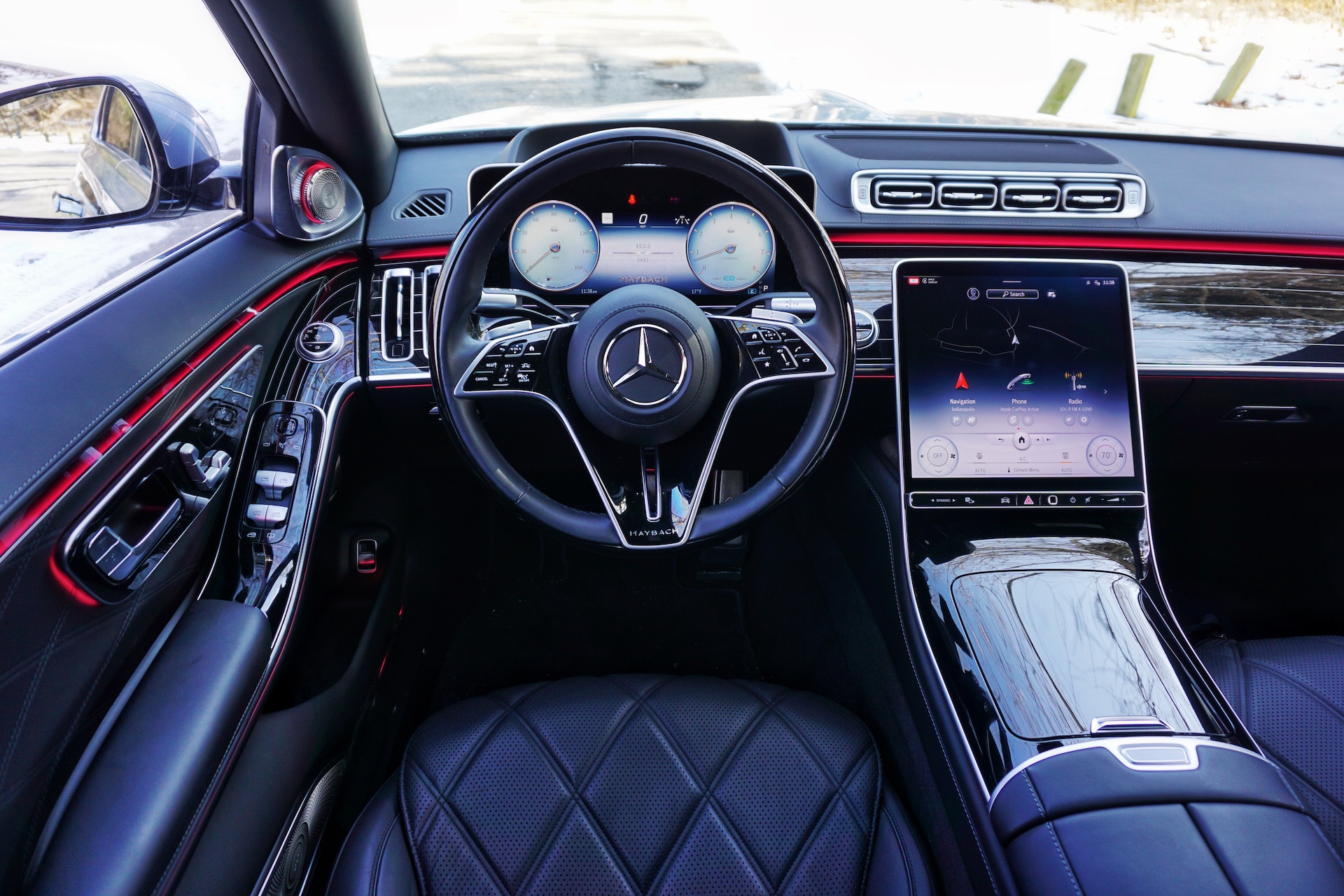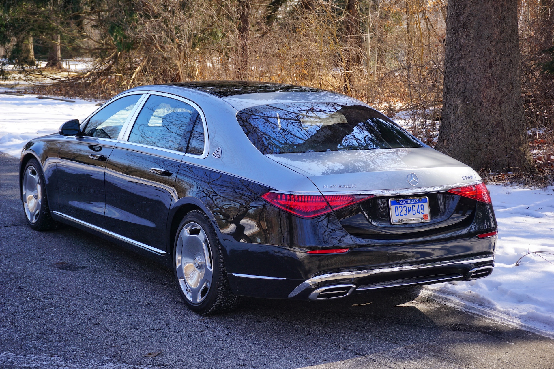 The rear is mostly still all S-Class, with Maybach contributing little more than a badge on the trunk lid. On the sedan’s extra-long sides, however, the two-tone paint job and 20-inch monoblocks create a silhouette that’s pretty eye-catching. The combination of the two paint hues, the mirror-like finish on the wheels, and the real estate occupied by the nearly 5,300-pound sedan create a presence worthy of royalty. Let’s just say it stands out in today’s endless sea of Toyota RAV4s and Honda CR-Vs.