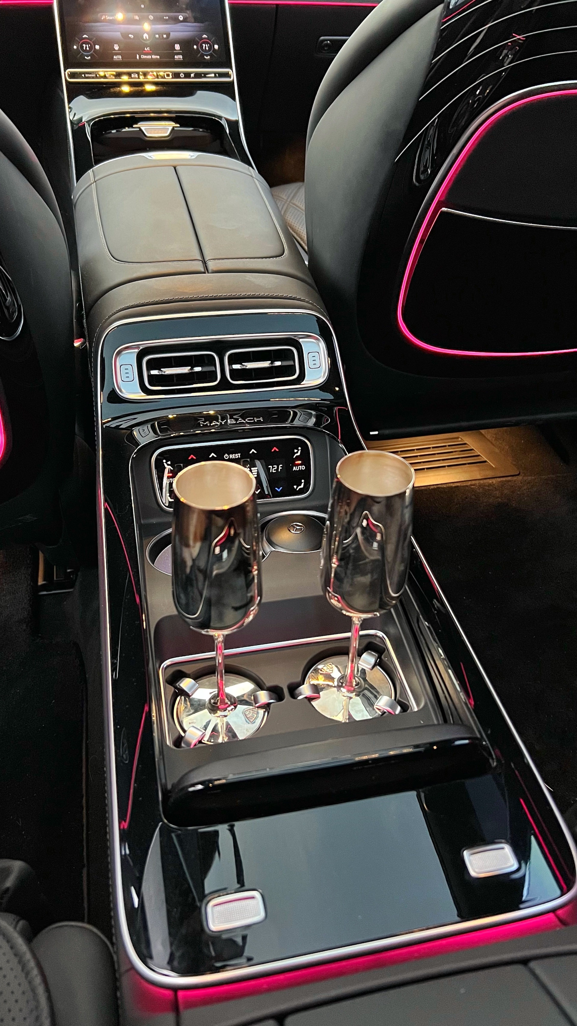 At the push of a button, this console reveals two heated and cooled cupholders, two bases with prongs for champagne flutes (so they won’t fall over while the car’s in motion), and most interestingly, two Mercedes-branded locking cups that serve as ashtrays. Yes, ashtrays. Leave the vaping to the Subaru boys, darling.