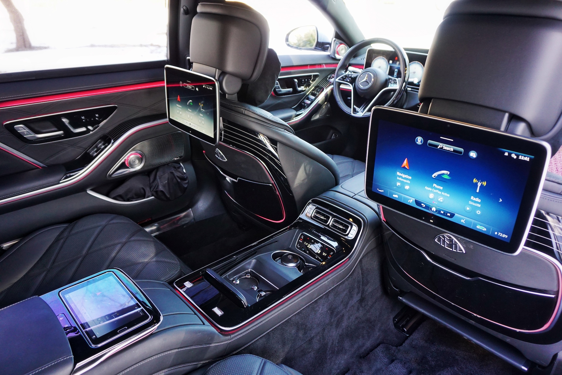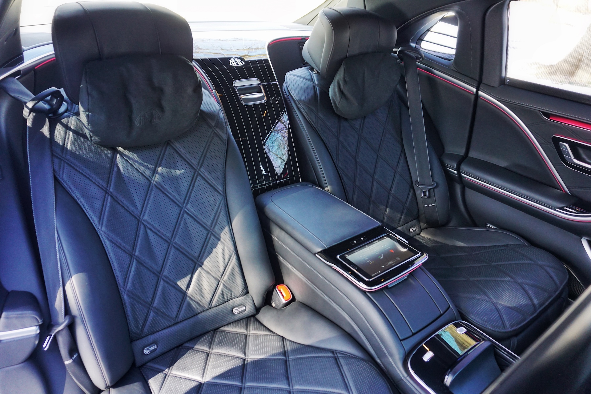 Rear occupants can control the car’s various systems via 11.6-inch touchscreens mounted behind each front seat, but should they choose not to lean forward while cruising down the road, they can also access the car’s power shades, lighting, HVAC, and media systems from the removable Android tablet built into the rear center armrest. This center armrest is embedded into the oversized center console that runs from the front all the way to the back of the car, essentially serving a division between the left and right seats.
