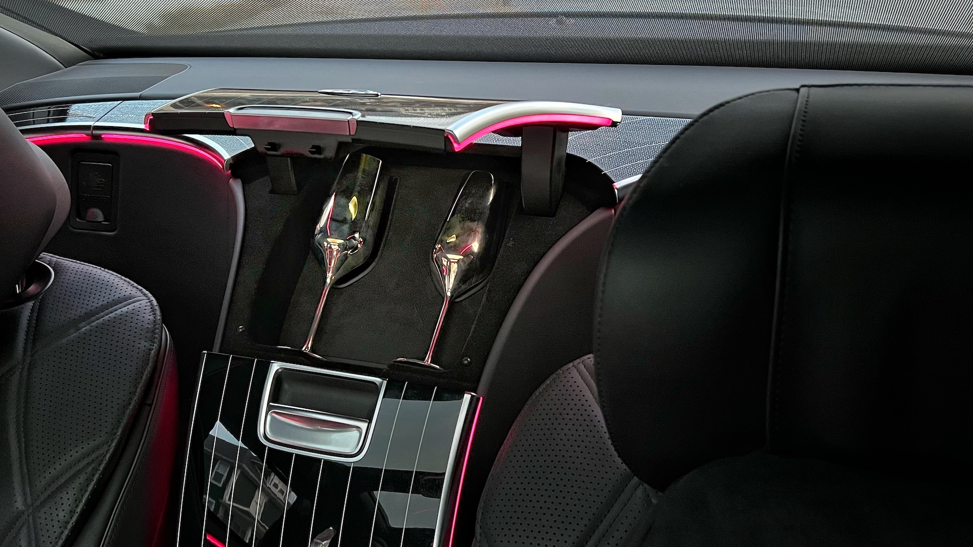 We chose not to pour our drinks into the $3,200 silver-plated champagne flutes because, frankly, I don’t know where all they’ve been and I didn’t feel like washing them. But we did store some water bottles in the $1,100 champagne cooler—which, by the way, is actually removable so you can make more room in the trunk if needed.