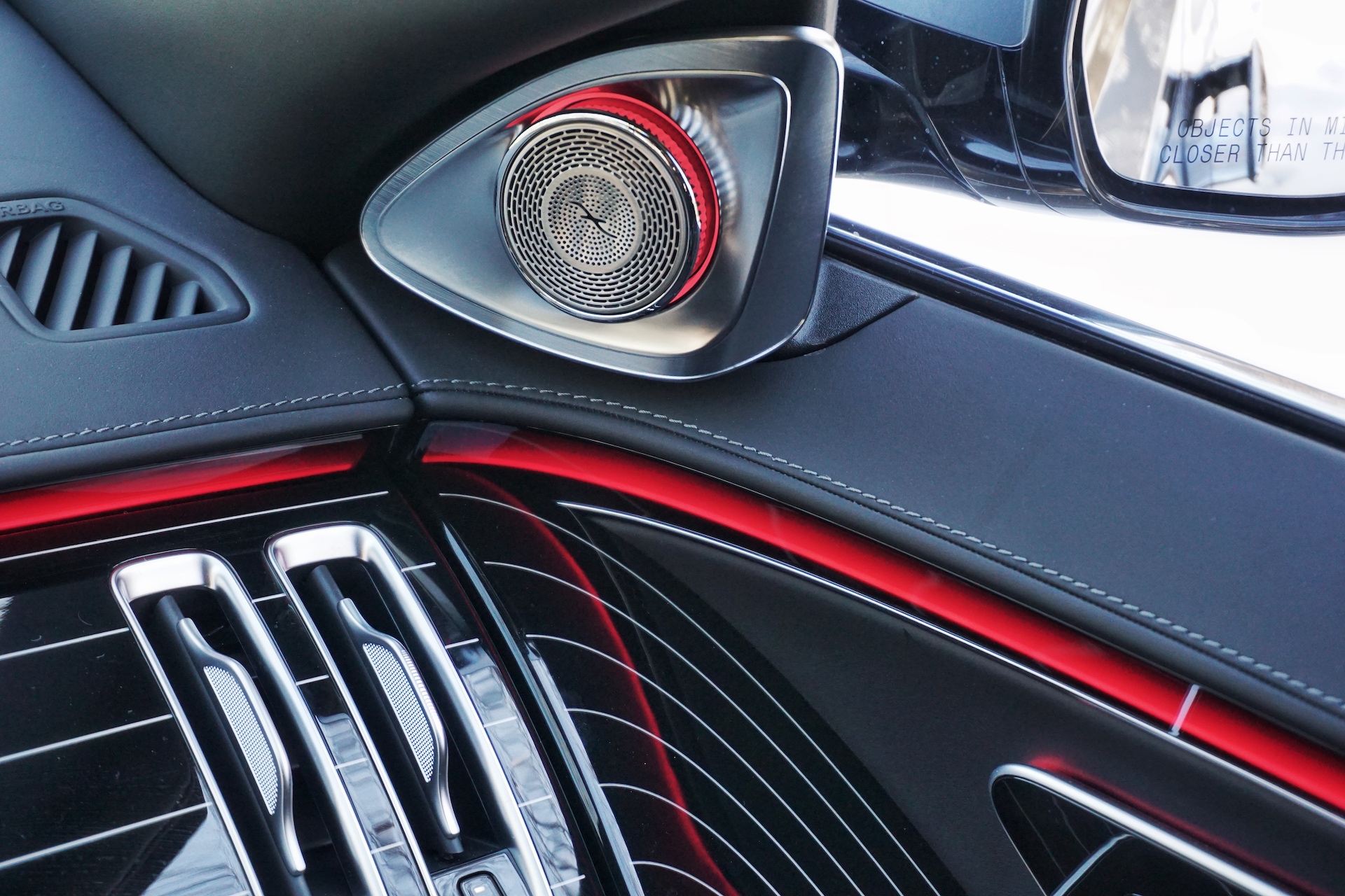 The cabin, too, is an impressive feat of avant-garde design. At first glance, it looks like another top-notch Mercedes cabin with long-running lines and minimalistic touches. Upon closer look, though, you can see silver accents embedded into the piano-black trim, aluminum air vents symmetrically embedded into the dash in a way that they almost disappear, yet when you finally notice them they look stunning on their own. The same applies to the metal-bodied Burmester tweeters embedded into the A-pillars, which automatically deploy when you fire up the car and then retreat when you shut it off. And when the sun finally sets and the ambient lighting appears, the entire cabin comes alive with a light show worthy of an Ibiza (ee-bee-thuh) nightclub.