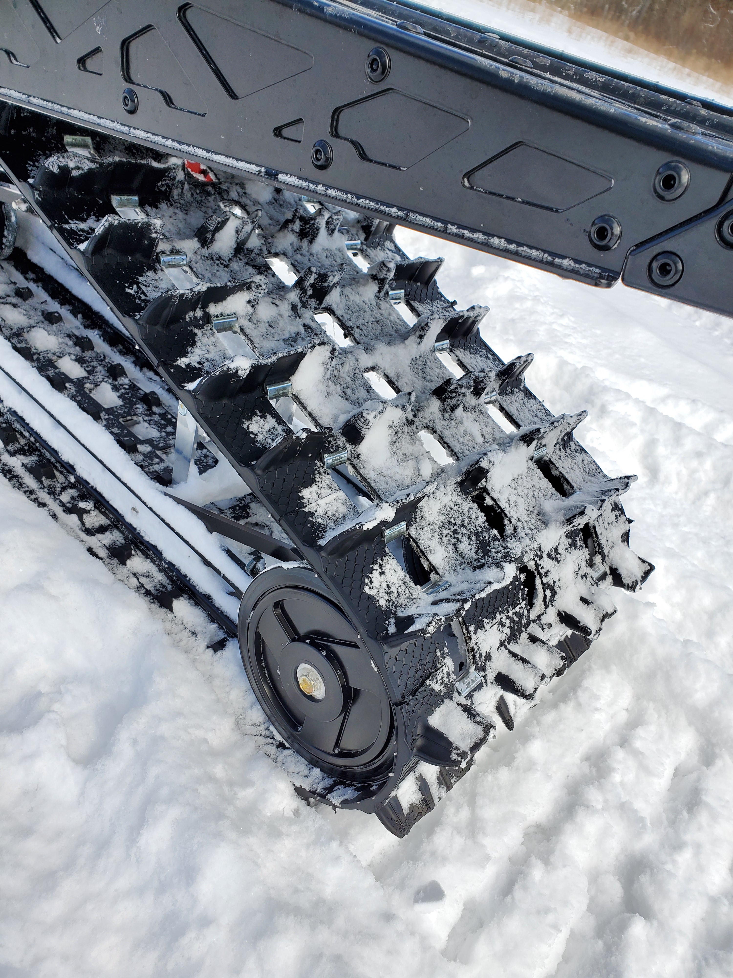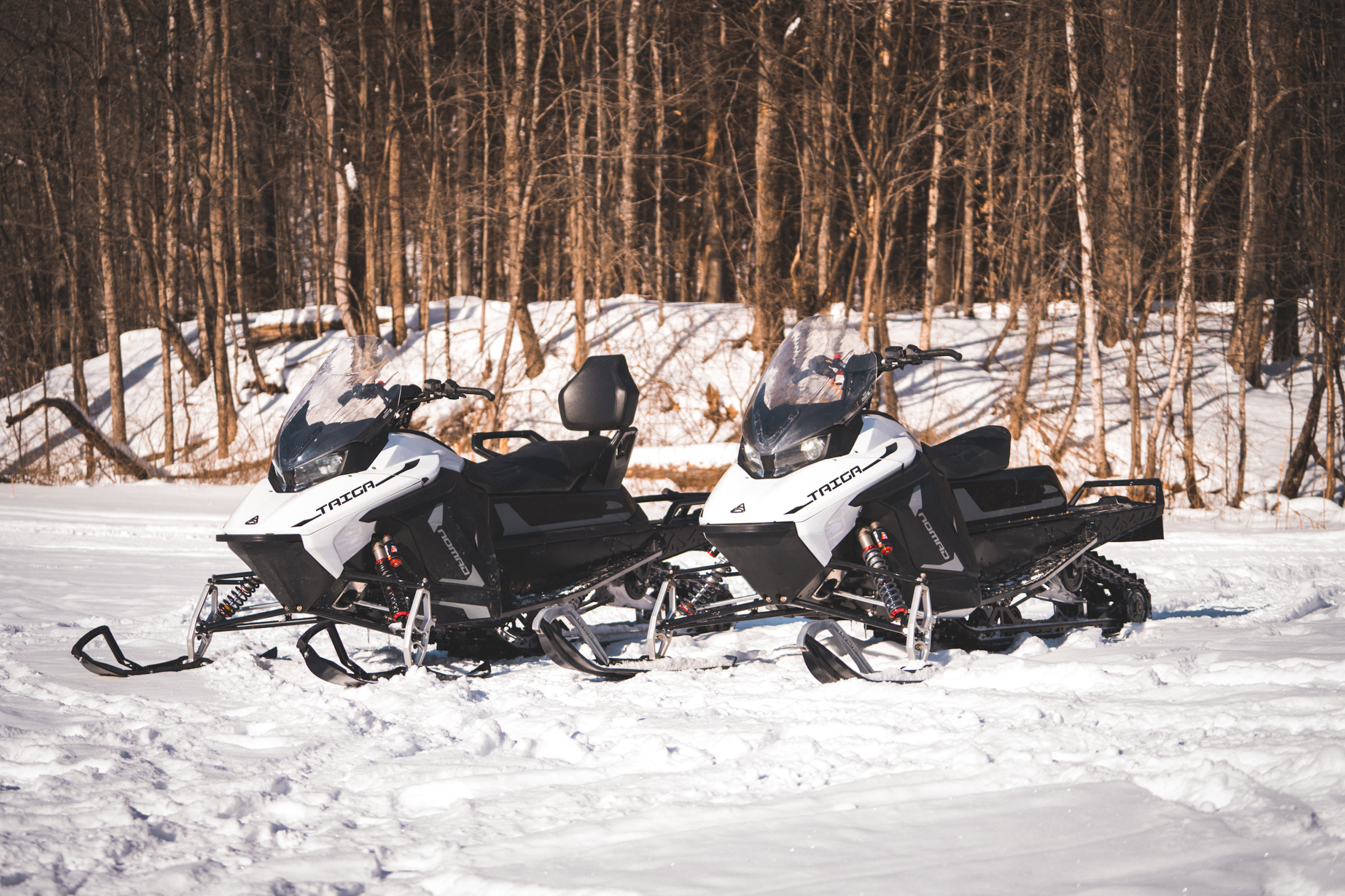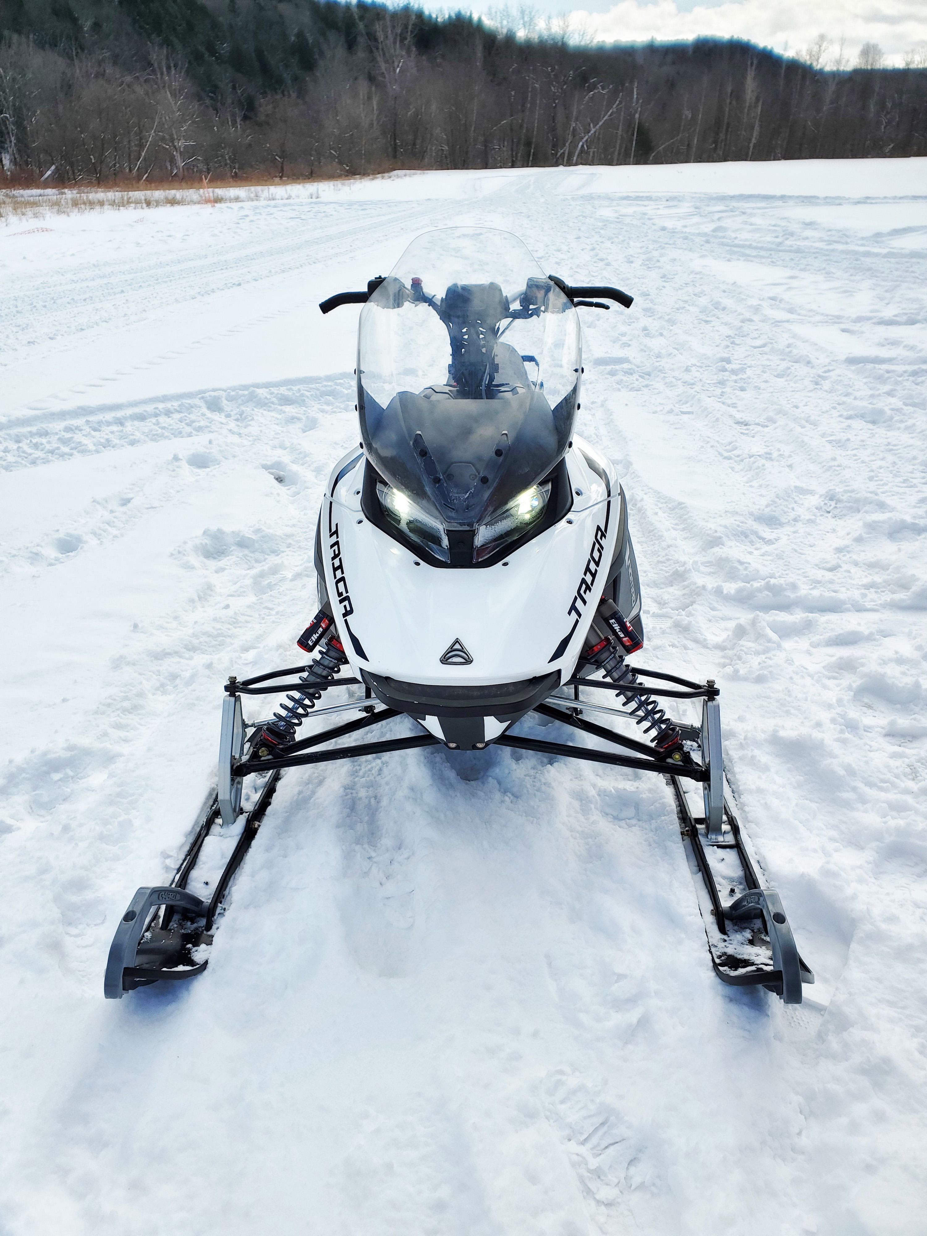 Looking at the Nomad, it’s not that different from a conventional snowmobile—which was perhaps the entire point. You can eventually expect three different snowmobiles from Taiga: the Atlas for trail performance, the Ekko for mountains, and this, the Nomad, for more all-around tasks like trail-running and towing stuff. That’s why it has an especially wide, 42.3-inch front track and a towing capacity of 1,125 pounds.