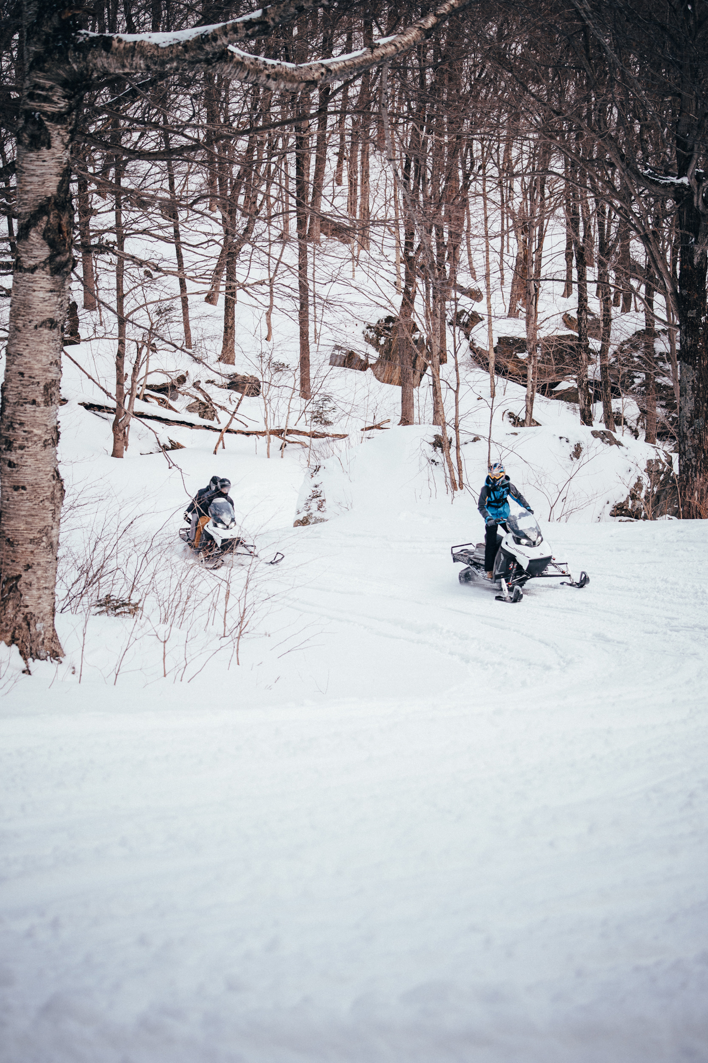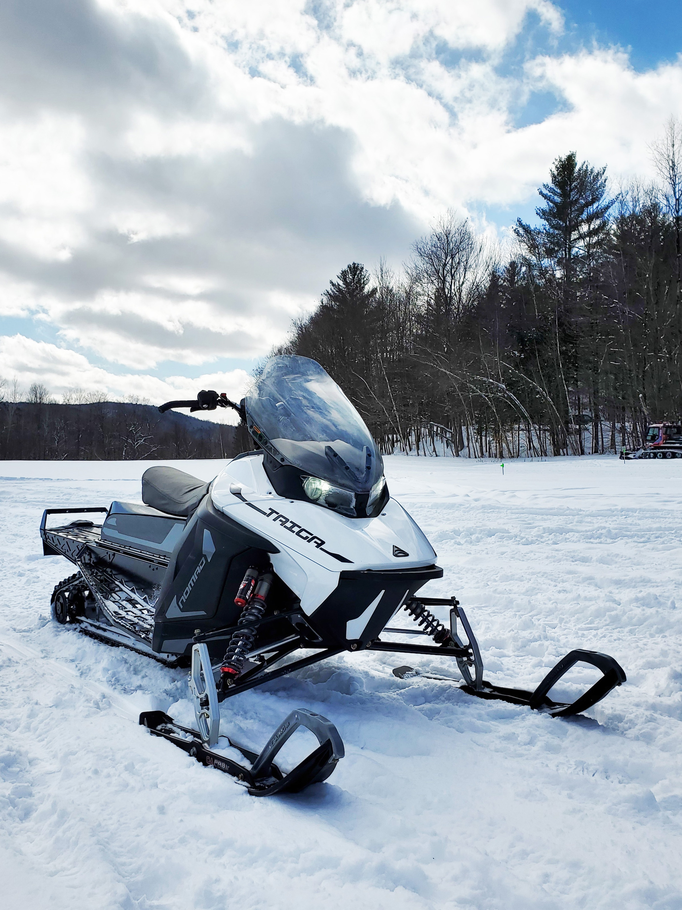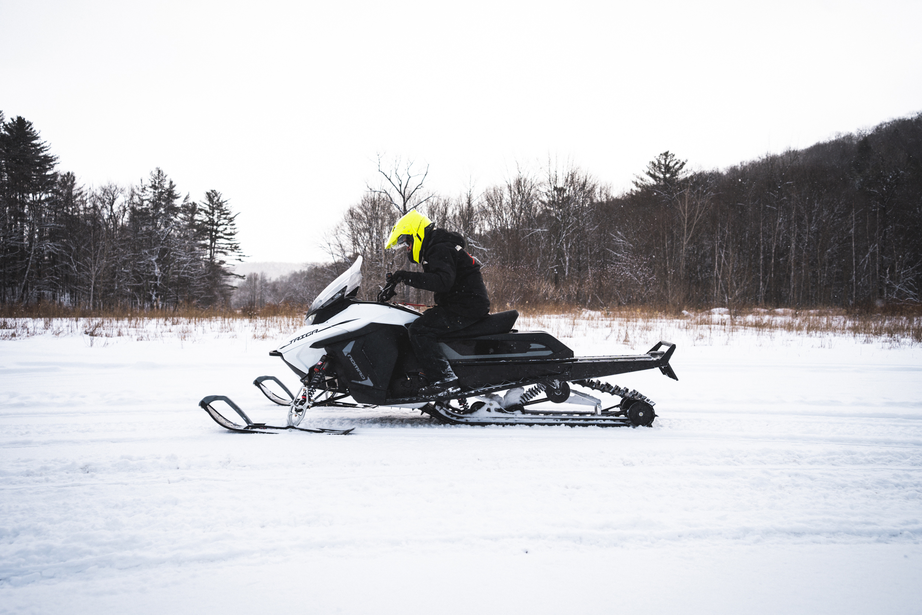 Letting off the accelerator means the Nomad stops pretty abruptly, so unless you have to panic-brake, I don’t imagine you’ll need that left-hand lever very much at all. I spent a few minutes learning how to balance the accelerator with how the snowmobile naturally slowed down and found myself acclimating to its one-handle driving almost instantly. Whether I was creeping forward or using the power to maneuver a chicane, I didn’t need to touch the brake once. At one point, a crowd of gasoline-powered snowmobiles roared past, spraying the 19-degree air with acrid exhaust fumes and I was powerfully reminded of another of the Nomad’s advantages: no emissions from a two-stroke to stink up the trails with.