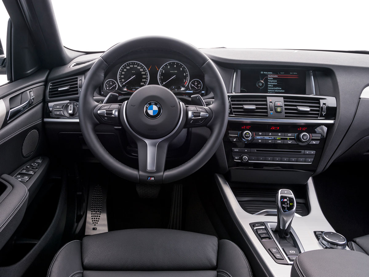 Here’s how: This is no badge-engineered phony, but a seriously engineered performer. BMW’s 3.0-liter, TwinPower turbo six is already born for Autobahn action. The M Division massages the muscle up to 355 horsepower, but it feels more like 400 in the real world. The M-tuned, low-backpressure exhaust is a high point, blatting exhaust backfires that make an M3 sound strangled and wimpy in comparison. The double wishbone suspension is strengthened, and front-end camber is adjusted to boost steering feel and response. The eight-speed paddle-shifted transmission is smoother and snappier than some dual-clutch units, maximizing thrust in any gear: The X4 slays 60 mph in 4.7 seconds—quicker than a 360-horsepower Porsche Macan S—and keeps churning to a 150-mph peak.