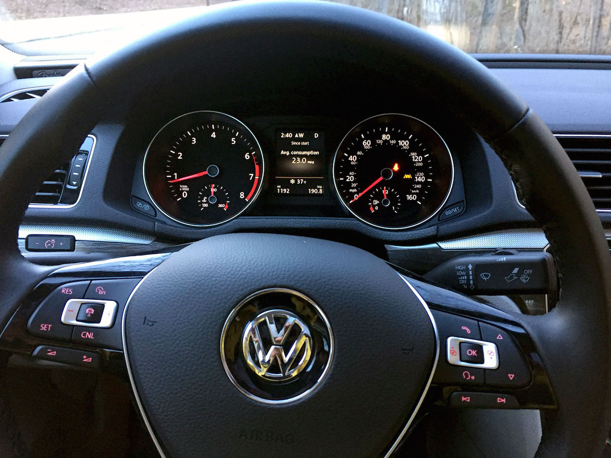 WHAT THE HELL IS IT? The 2017 VW Passat is a sweet, comfy, easy-handling and good-looking midsize sedan that can be had for $30,000. It’s quiet on the inside, has plenty of room up front, in back, and in the trunk. The instrument cluster is good looking in clear white, and the cockpit controls are very well thought out—clear and straightforward. During driving, the interior is well lit at night with red LED lights from the headliner and dim white lighting in the footwells.