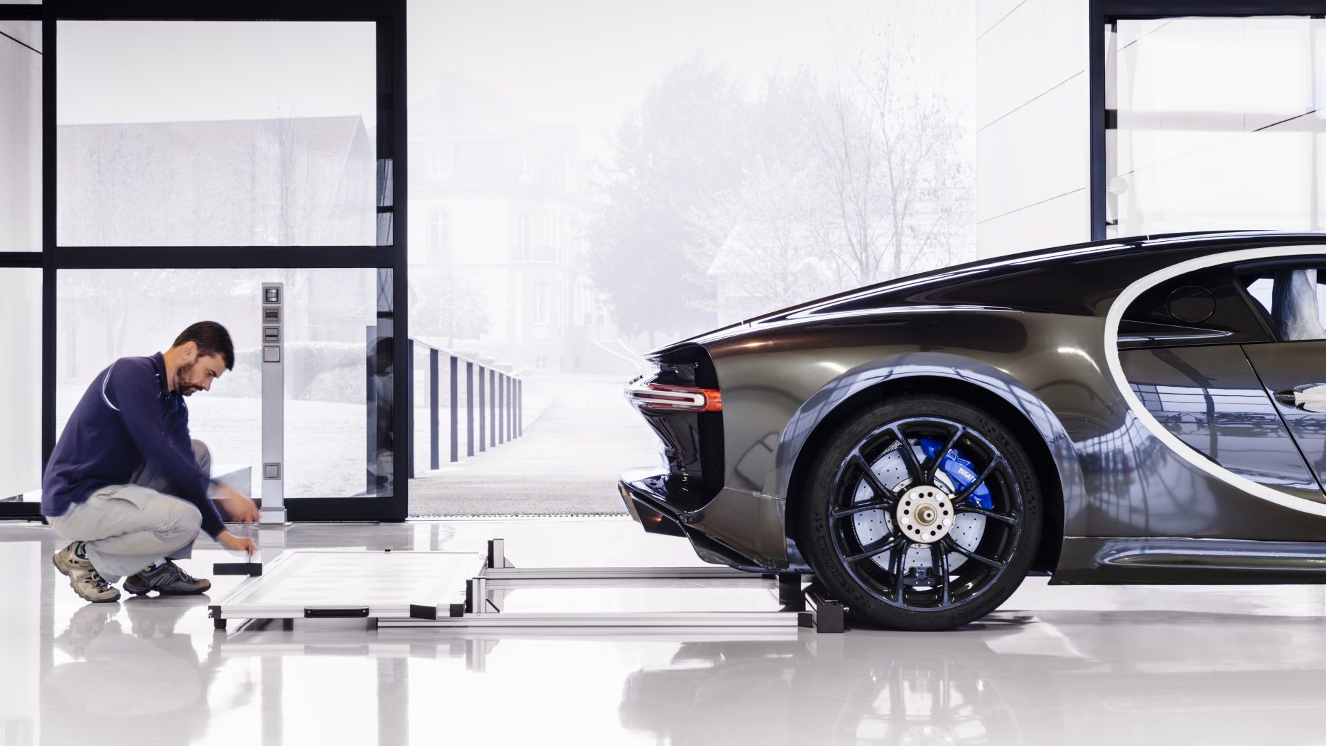 After this stage, the chassis travels a few metres to the rolling dynamometer. This is the part of the production facility that called for the greatest investment in preparation for the Chiron. The modifications, including larger electric cables, were necessary as the old rolling dynamometer could not absorb the 1,500 PS and 1,600 Nm developed by the Chiron. The new unit is so powerful that it can produce electricity with a current of up to 1,200 amps during operation. Bugatti feeds the excess power generated to the local grid in Molsheim. The Bugatti rolling dynamometer is the most powerful of its type in the world.