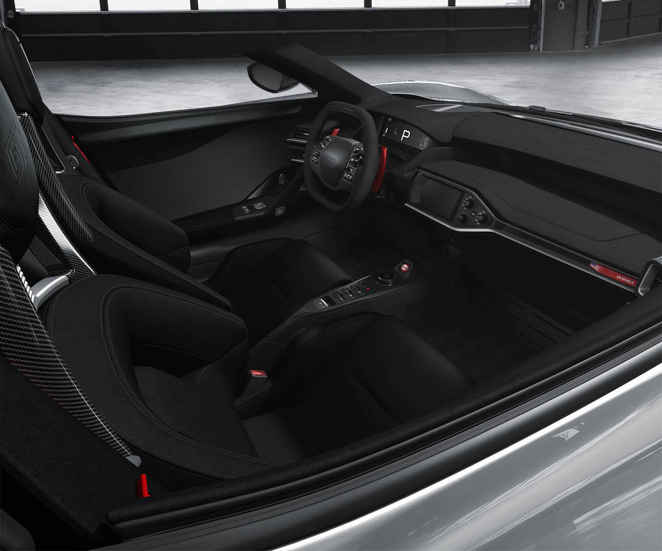 Ford says it has eliminated “items not essential to performance—including air conditioning, radio and speakers, stowage bins and cupholders.” But that’s just the easy stuff anyone could rip out. Ford has gone to European supercar-maker lengths to eliminate weight in other places, too, like replacing the engine hatch cover with Perspex, using a manual latch, and adding a carbon fiber prop rod. The wheels are now made from carbon fiber, and even the lug nuts are titanium—as well as the exhaust now, too. The glass in the bulkhead—which separates the cockpit and the engine bay—is now made from Gorilla Glass, which is half as thick as normal glass and lighter, too.