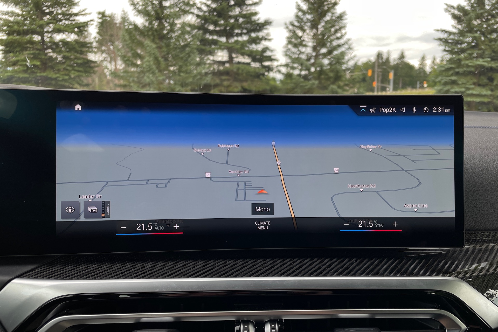 When you start digging into the actual layouts, though, iDrive 8 isn’t a huge functional overhaul over the previous version. You’ve still got shortcuts on the left side for the most used functions, and then more granular commands for whatever screen you’re currently in on the right. Just like before, BMW’s built-in navigation is, as far as proprietary OEM nav systems go, one of the better ones out there, especially when it comes to how it audibly and visually delivers turn-by-turn instructions. Big, clear, and detailed maps on both the screen and the head-up display show you exactly which lane you should be in and which exit you should take.