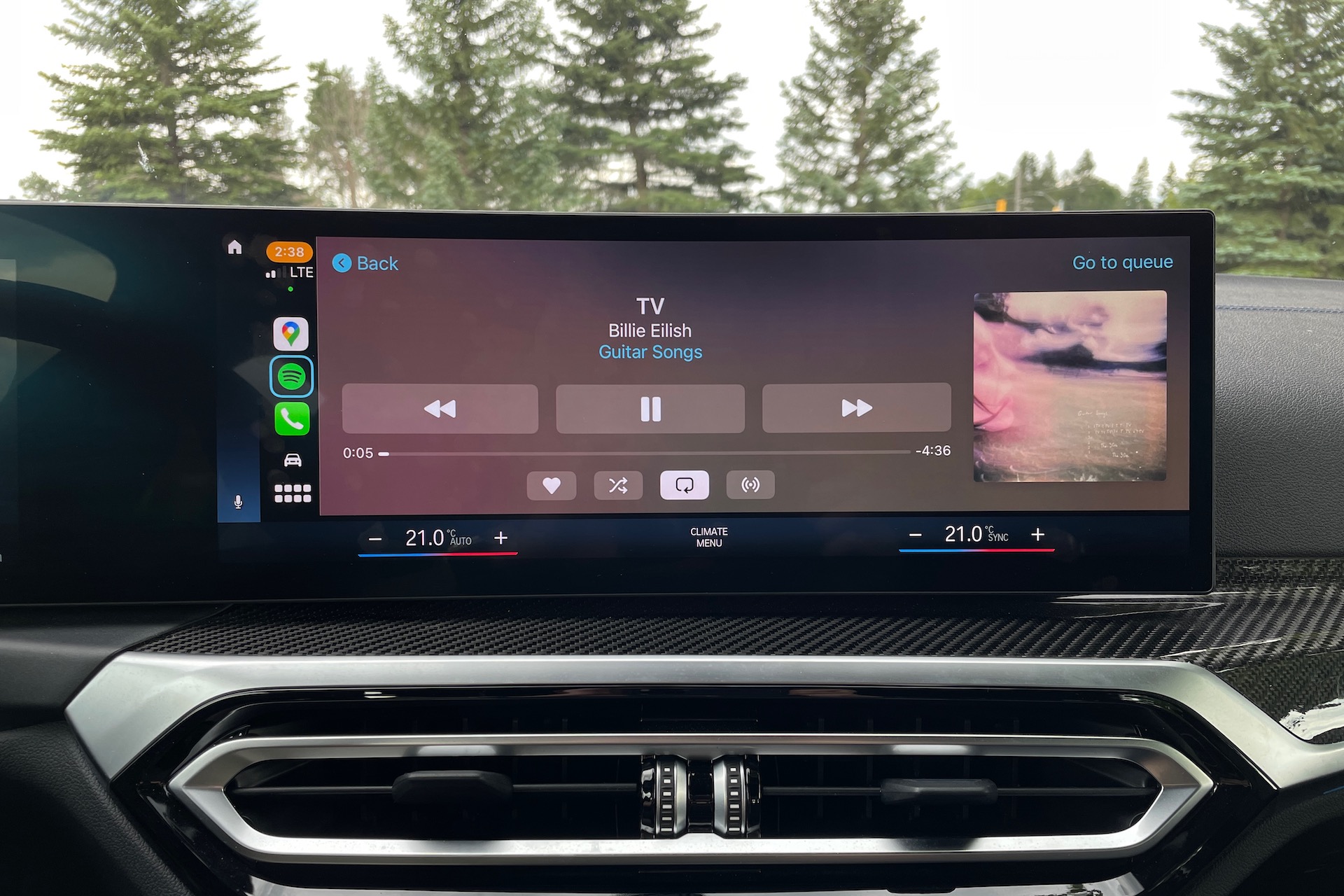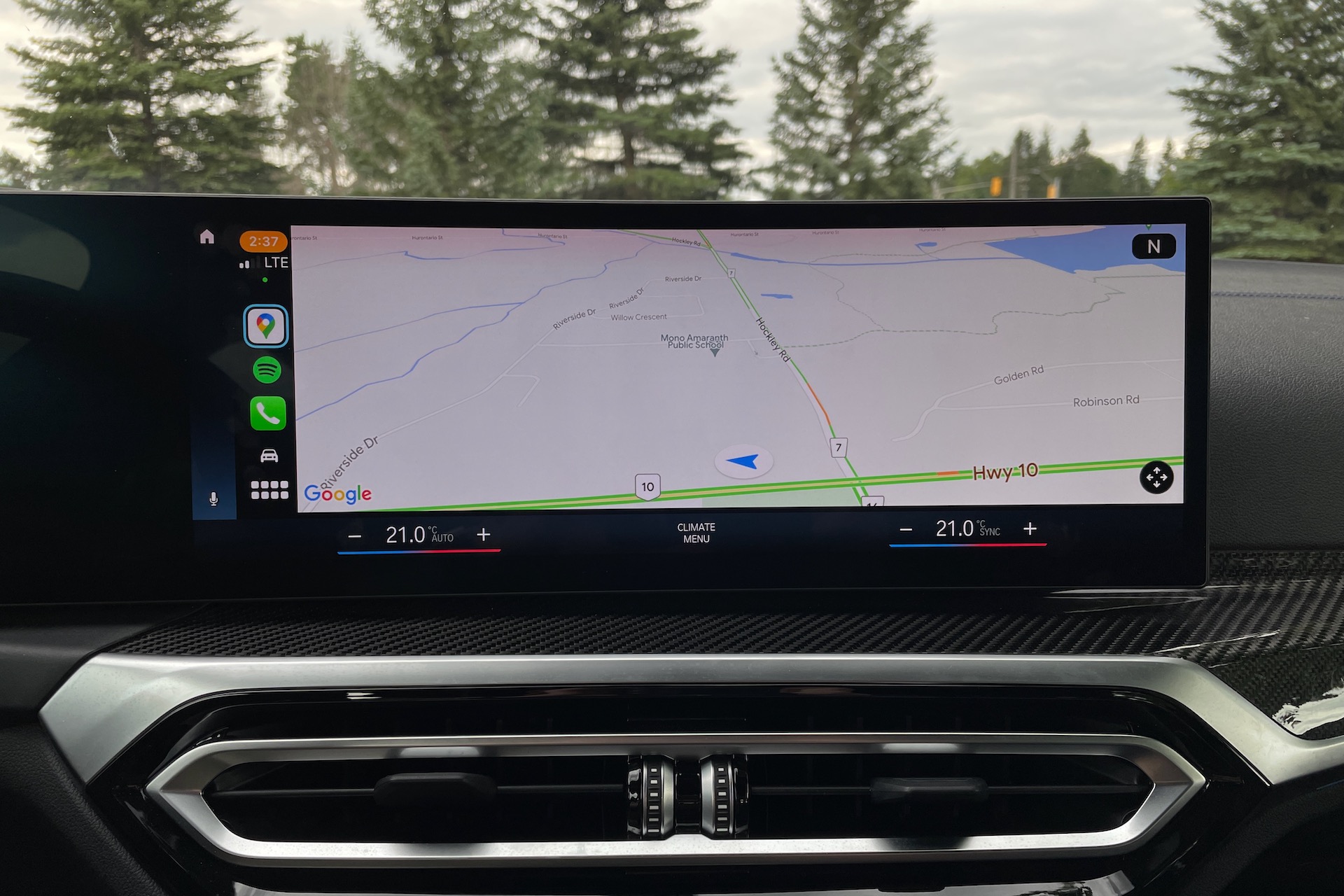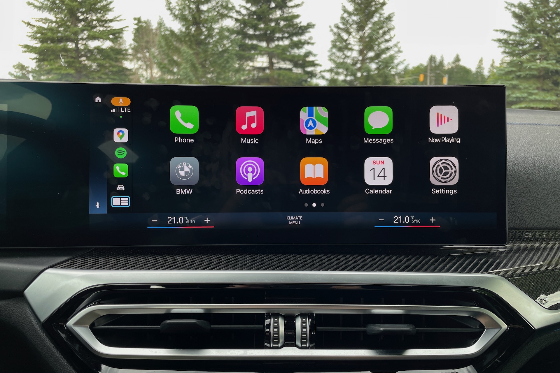 If you really do not want to deal with BMW’s native interface very much, Apple CarPlay and Android Auto are, of course, both on-board and wireless. I can’t speak to Android Auto, but CarPlay implementation is indeed wireless, quite reliable, and takes up the entire screen, bar the HVAC section at the bottom and BMW’s home button on the top-left that takes you back to the native system. No complaints here.