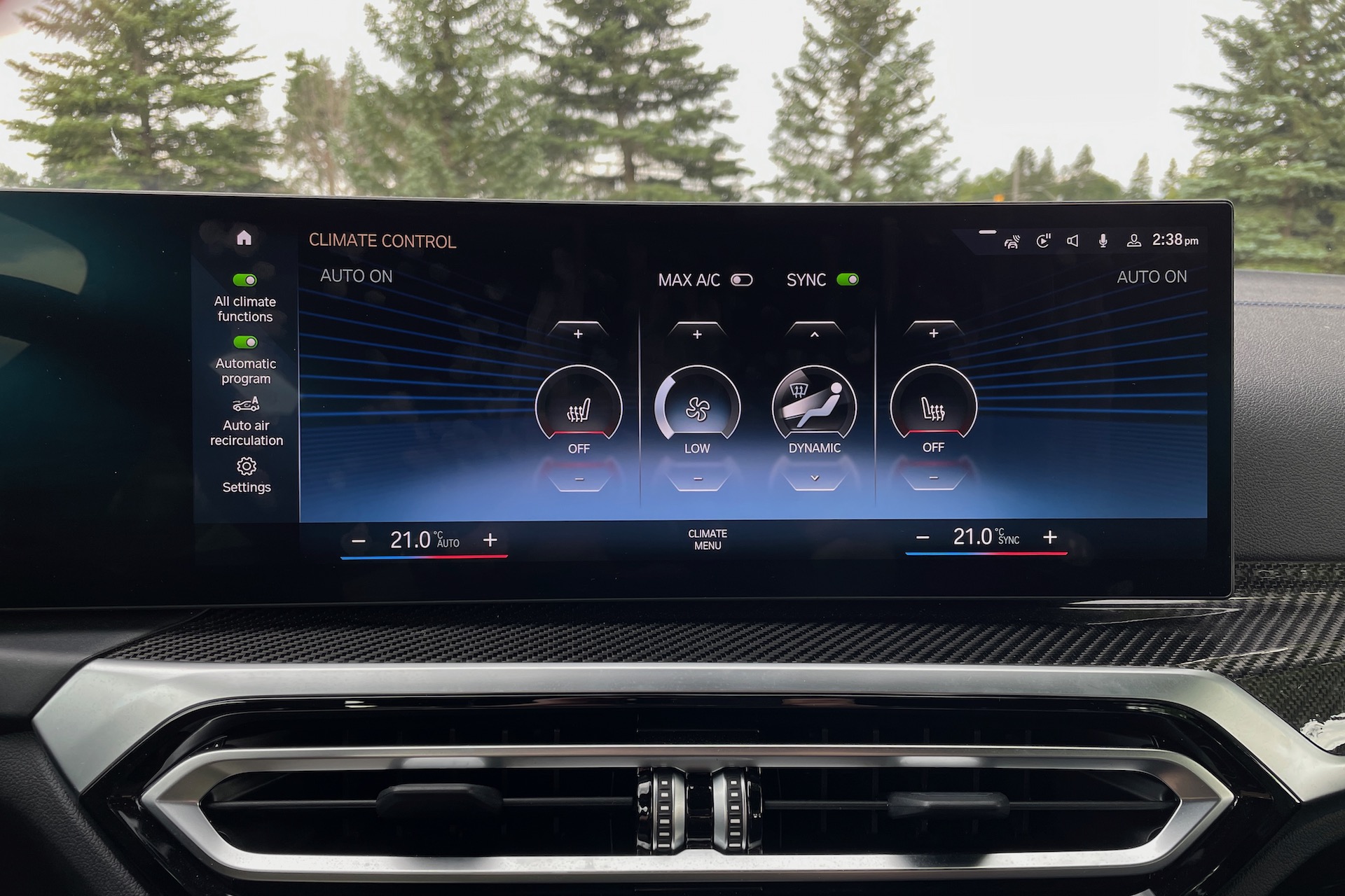Bad news, hard-button fans. BMW has got rid of the hard buttons for climate control. All of that now lives permanently at the bottom of the touchscreen. This reminds me of the new Volkswagen Golf’s climate controls—an association BMW shouldn’t really want, trust me—although, at least you can see these ones at night. Hitting “climate menu” in the middle brings up detailed controls like fan speed, where exactly the fans blow, and heated seat controls. As somebody who mainly keeps things in auto and only changes the temp, I actually didn’t mind this too much, although I’m still convinced buttons would’ve been better.