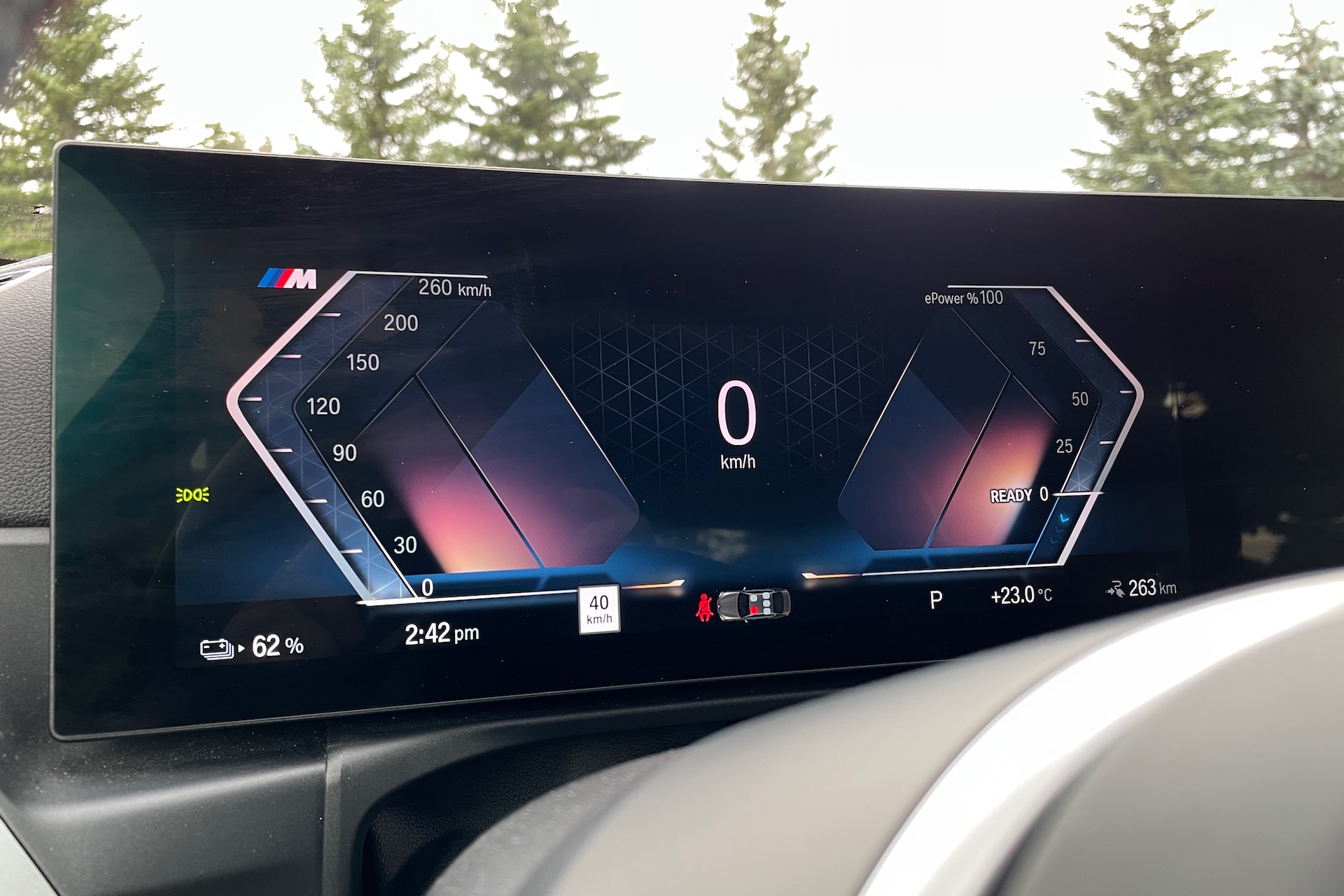 The new gauge cluster graphic is very non-traditional but admittedly neat-looking and features a cool, minimalist mode that really does ease up on the distraction. Switching this car into sport mode changes the entire UI’s color scheme to red and purple while eco pro mode makes it blue and yellow.