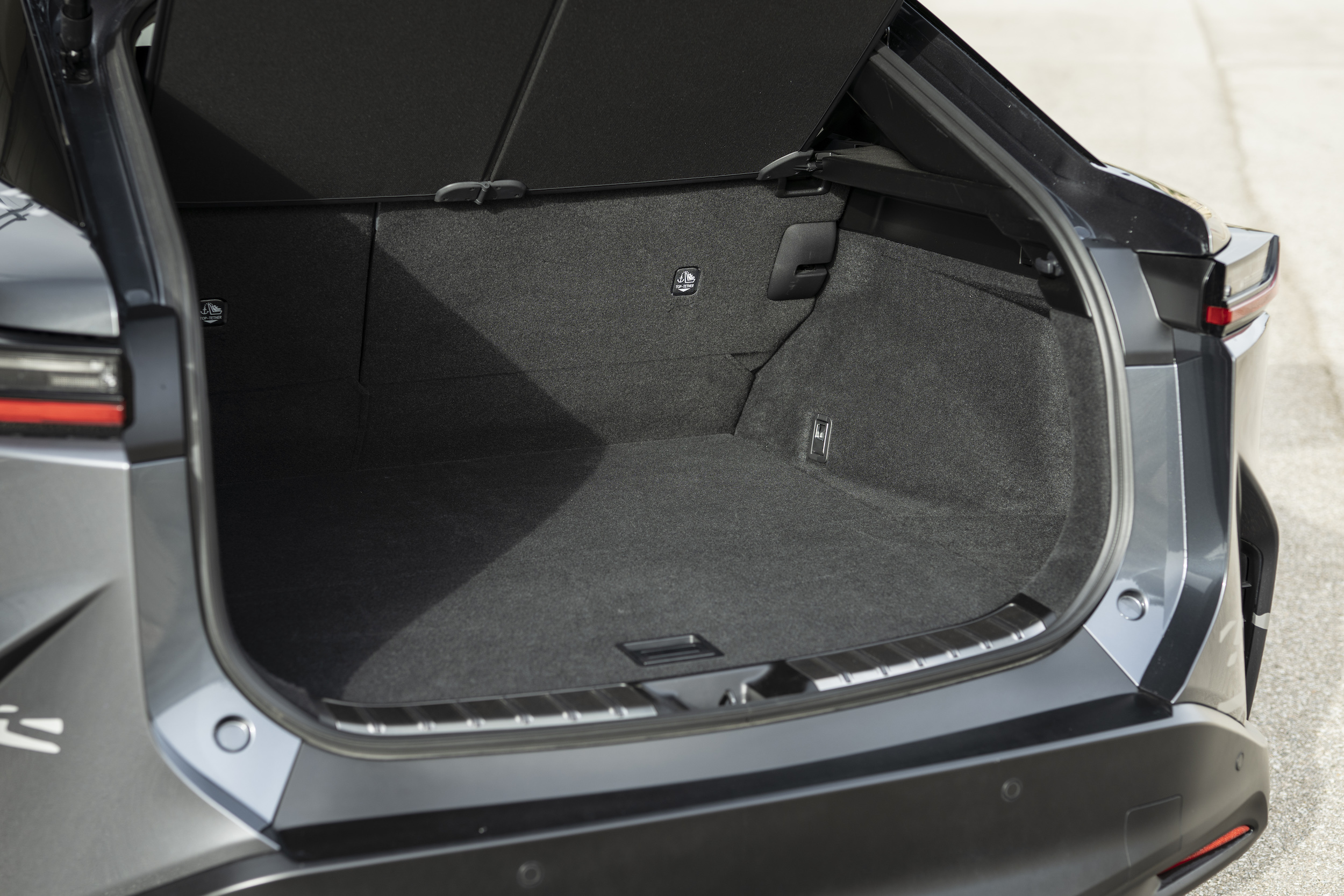 Power comes from two electric motors (one per axle for through-the-road all-wheel-drive) zapped into motion by a 71.4-kilowatt-hour lithium-ion battery pack. The unit assigned to the front wheels is mounted upright to clear up more space in the cabin, though this is achieved at the expense of a frunk, and it’s rated at 201 horsepower. Out back, a motor is installed on its side to lower the trunk’s floor and its output is pegged at 107 horsepower. Put another way, the RZ uses the front-wheel-drive bZ4x’s front motor and the all-wheel-drive model’s rear motor, though the latter’s power controller is fitted with a silicon carbide semiconductor that the Toyota’s does not get. While Toyota makes two drivetrain configurations available, Lexus hasn’t decided if it will add a front-wheel-drive model to the lineup yet.