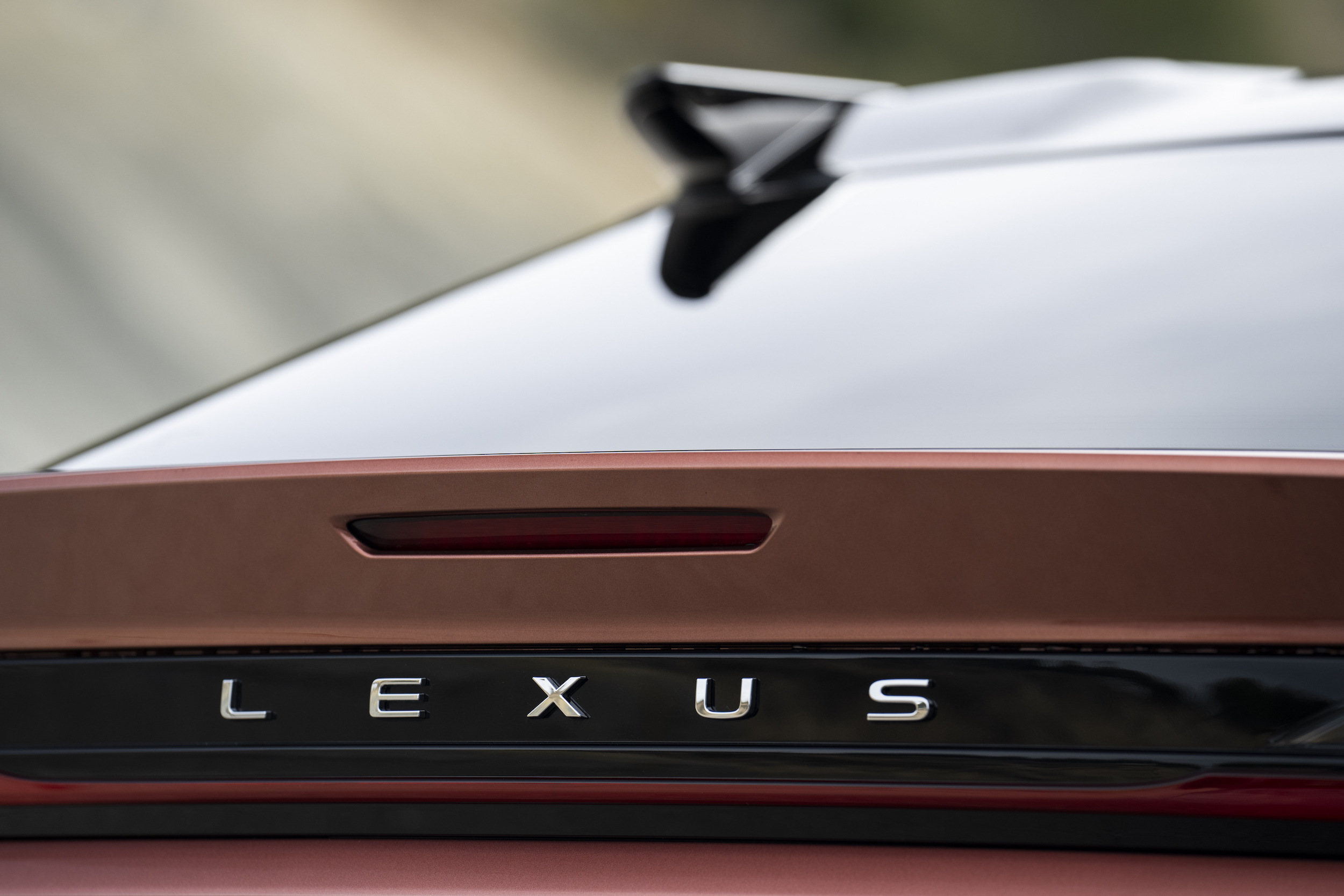 The RZ falls in line with the current Lexus design language even without the massive spindle grille thanks in part to a spindle-shaped insert flanked by angular headlights. Its roofline is raked without sinking too far into the murky “four-door coupe” swamp, while its back end is characterized by a horizontal light strip accented by “LEXUS” lettering and an almost duck tail-like spoiler integrated into the hatch.