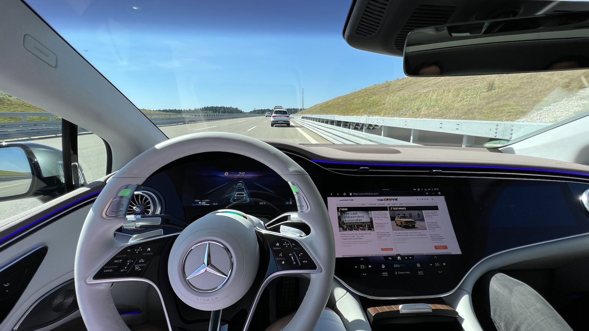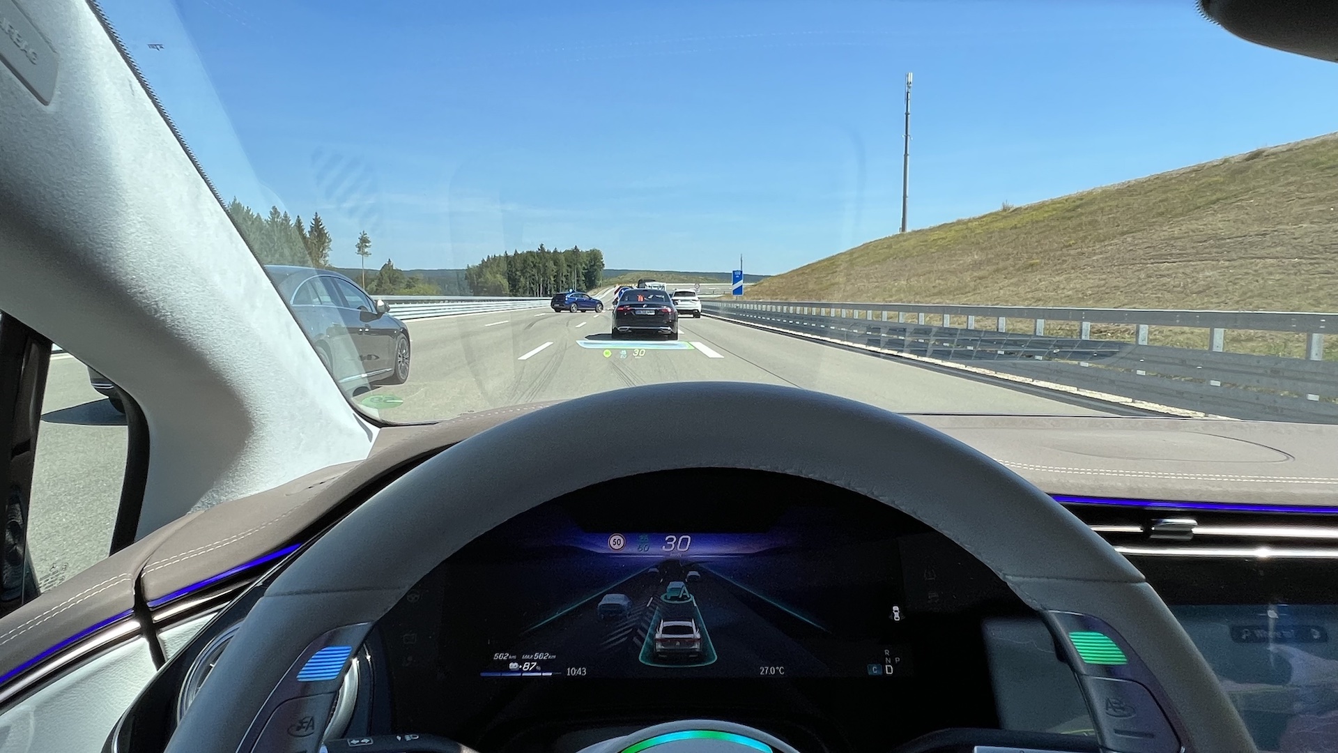 Then, it happened again, another sudden move by those pesky actors pretending to be real drivers: An EQE in front of me decided to pull over onto the right-hand shoulder—but not entirely. Some of the car was still in my lane. Drive Pilot recognized this situation and veered slightly to the left, safely passing the “stranded” car. No drama. We kept going.