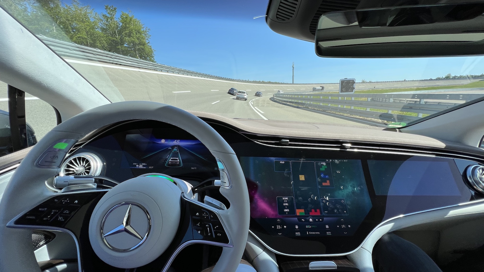 The longer I drove, the more difficult the obstacles got. One time, a Mercedes semi-truck merged onto the track and cut off several of the actor cars, making them swerve erratically in front of me. However, because this was happening way ahead and most cars kept up their speed, my car chose to do nothing. I knew it had recognized this situation because I could see it register on my screens, but otherwise, the EQS kept its trajectory.