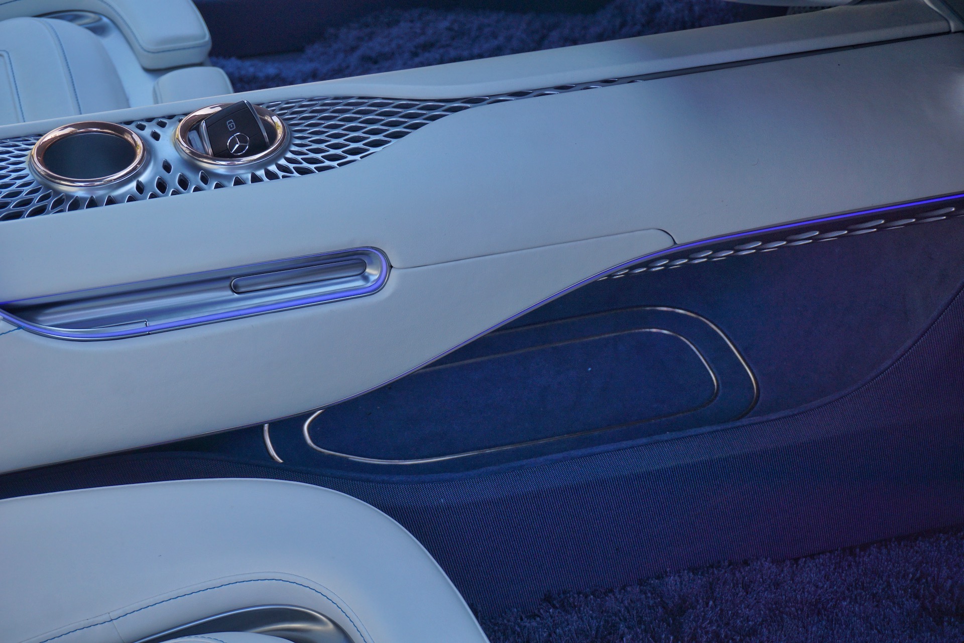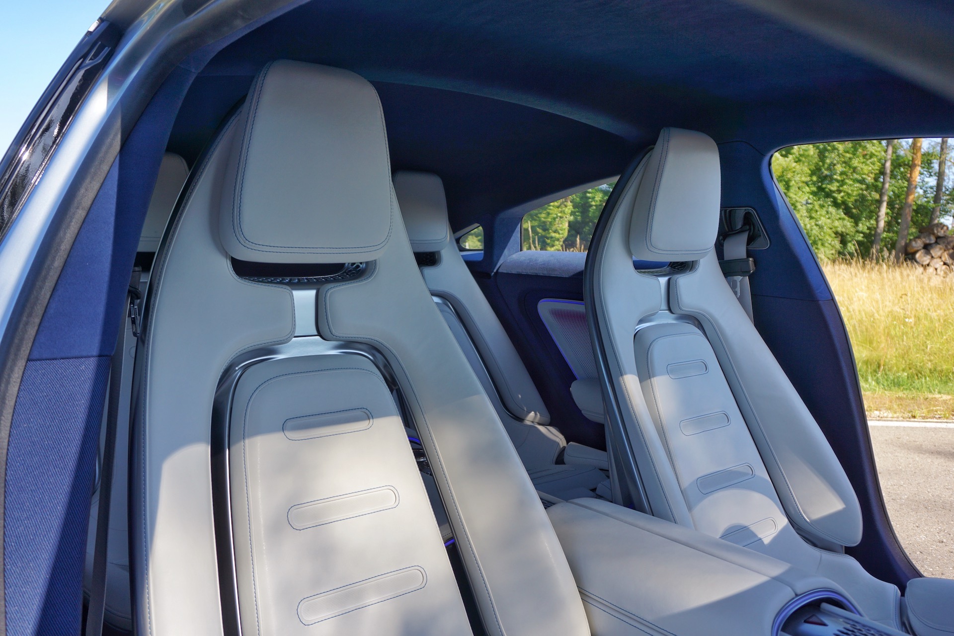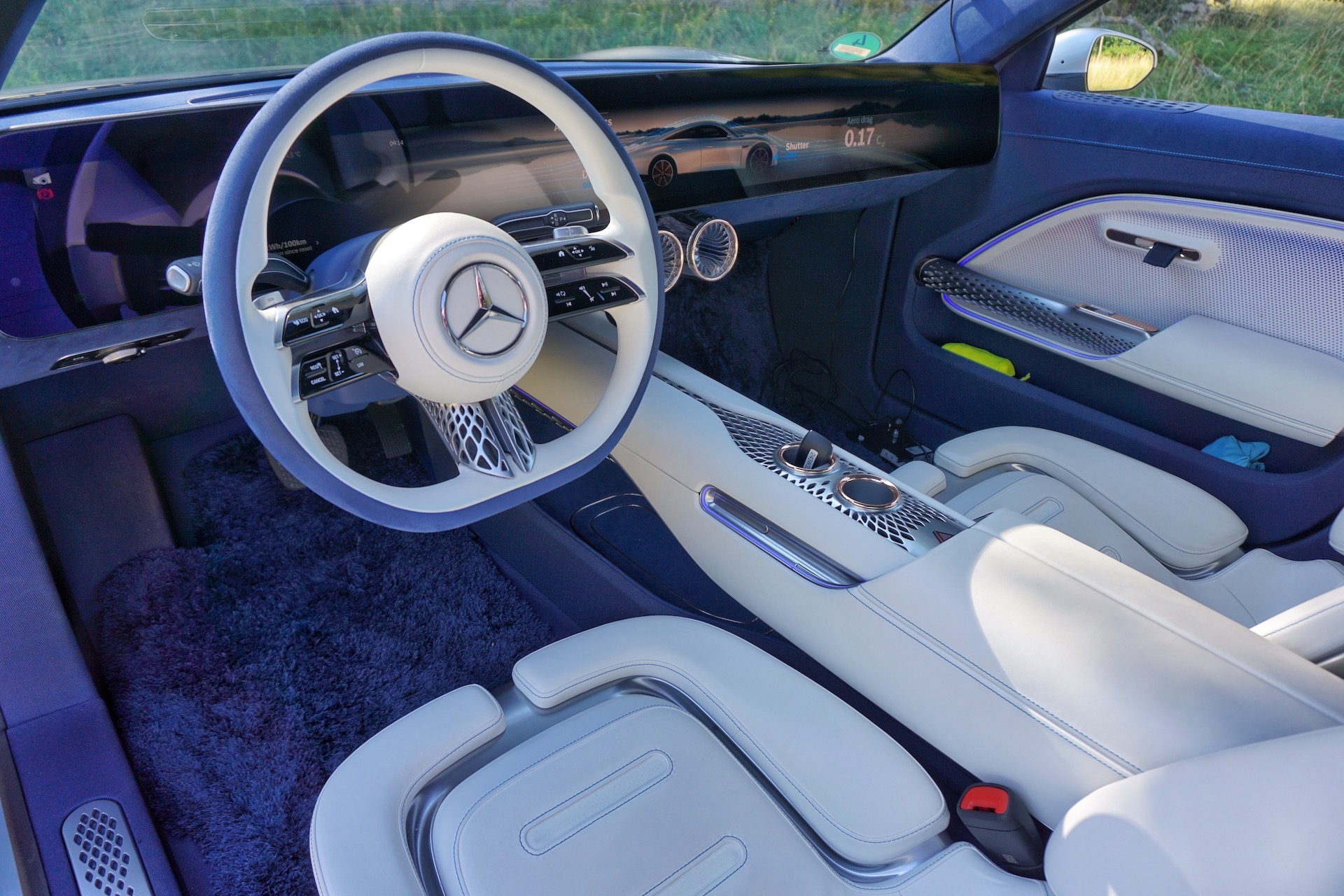 I wasn’t behind the wheel to break any records. My co-pilot—an EQXX engineer—recited key objectives for the drive, such as a target efficiency of under 10 kWh per 100 km, though I was still trying to catch my bearings after squeezing my large frame into the low-riding prototype. Despite it being a big car with a spacious cabin, the door openings are narrow and the roofline is low. The seat and wheel also have limited adjustability compared to a production car, making it tricky for me to get in and out without looking like a clown.
