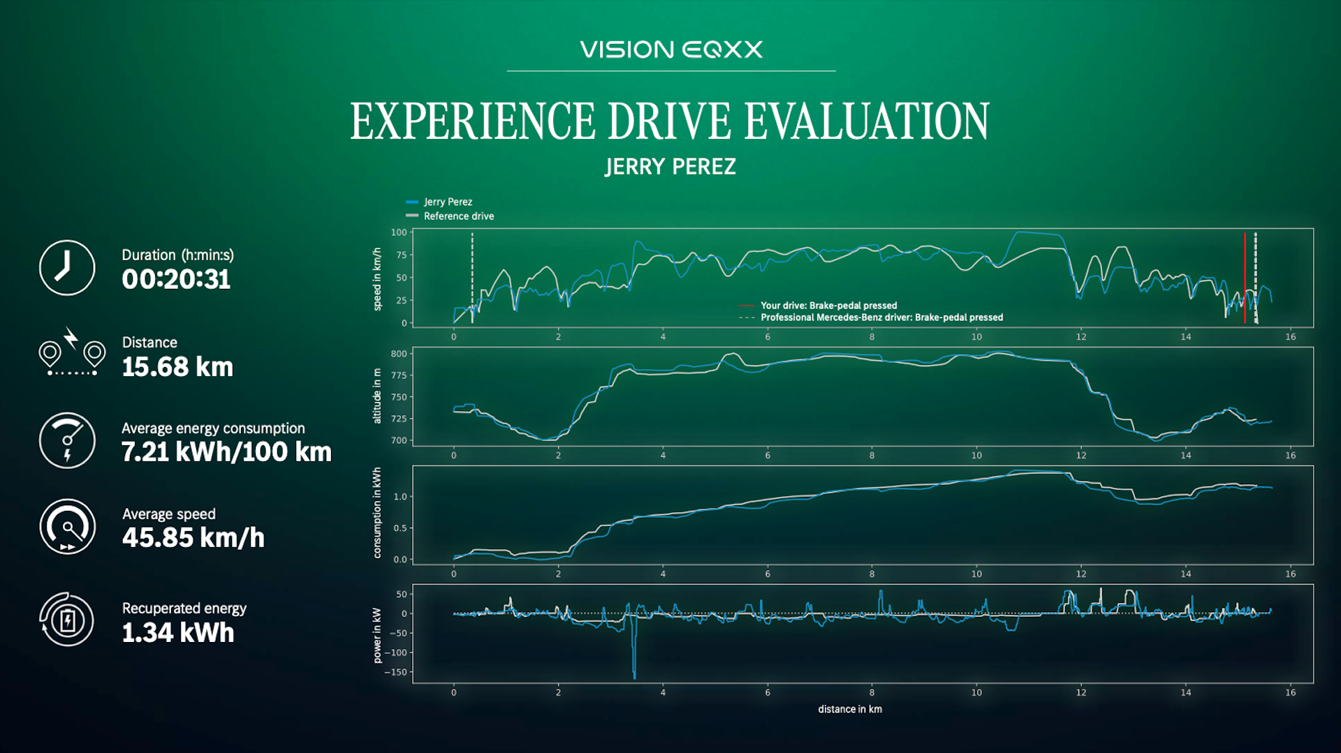 It turns out I drove much more efficiently than I imagined: 7.2 kWh per 100km(!) average consumption. This was better than the 7.9 set by a Mercedes driver during testing, which was pretty amazing, I was told. My average speed was 45.85 kph (28.48 mph) versus their 49.32 kph (30.64 mph), meaning my superb efficiency was a result of my slightly slower speed—but I can live with that. Also, telemetry showed I only used the brake pedal once during the recorded 20-minute run.