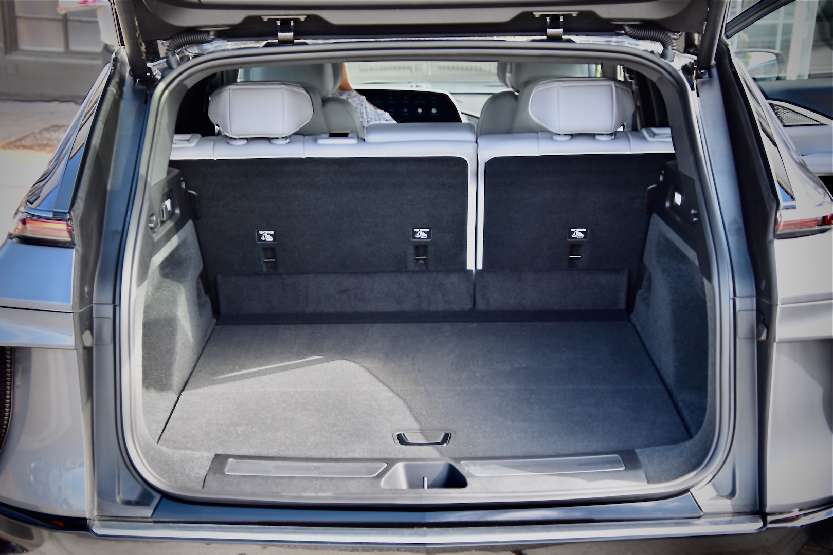 The Lyriq is a spacious place, with significant headroom under its panoramic sunroof, tons of leg room, and plentiful storage. There’s space beneath the floating center console, two popout drawers under the dash, a subfloor area in the trunk, and even a clever “piggy bank” slot to stick seatbelt buckles when you fold the rear seats flat. GM locked one of the drawers in the test cars due to a bad damper, which they said made it clunk open, and the glove box can only be opened through the touchscreen. Both I consider goofs, the former of which should be watched for on production cars.
