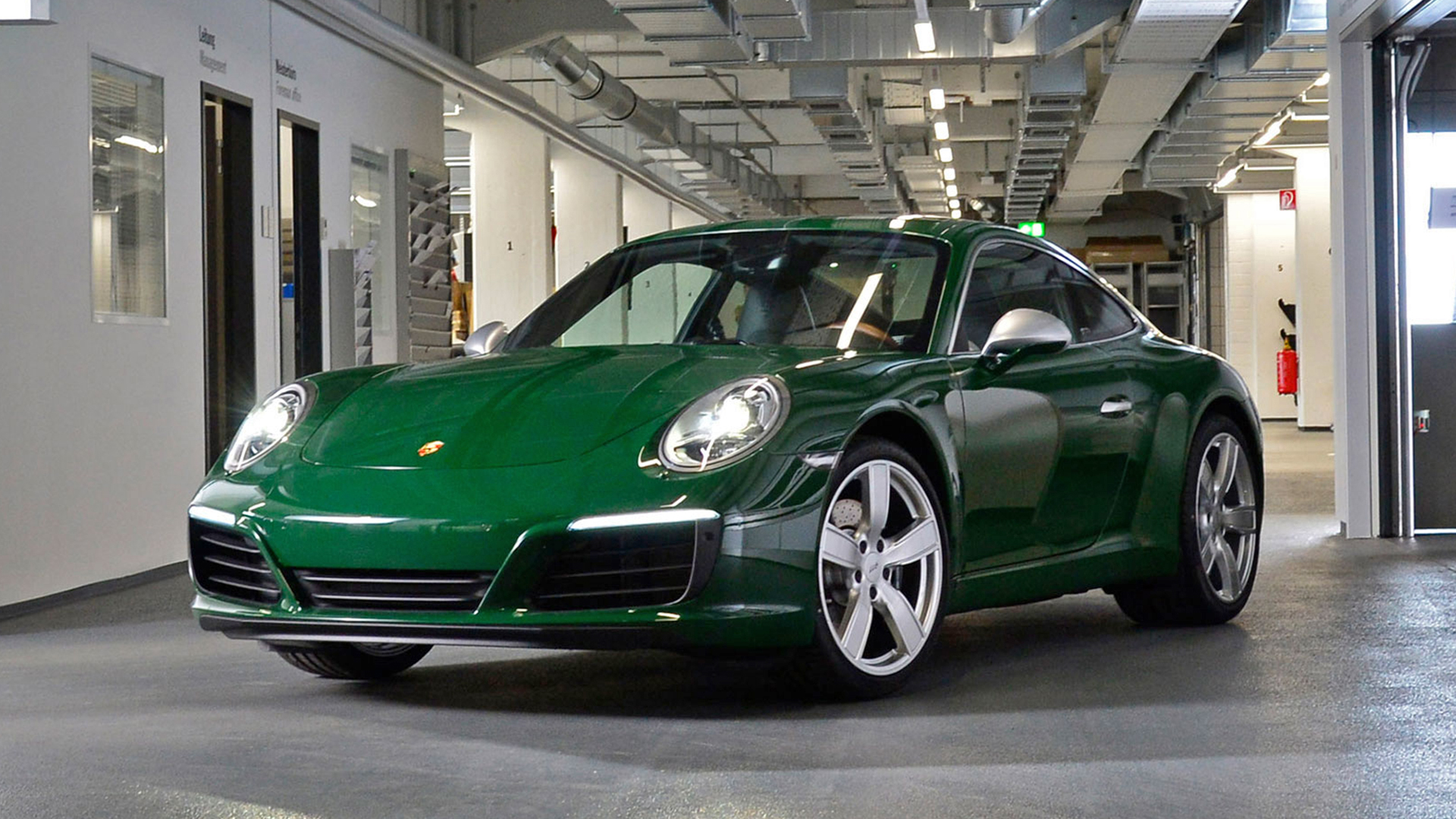 The Irish Green 2017 Porsche 911 Carrera S comes bearing plenty of homages to earlier 911s; the paint color itself dates back to the early days of the 911 in the 1960s, and the interior is outfitted in wood, leather, and old-school black-and-white checkerboard inserts. There’s a special plaque on the dashboard commemorating the car’s special place in Porsche history. And, of course, it comes equipped with a good ol’ manual transmission.