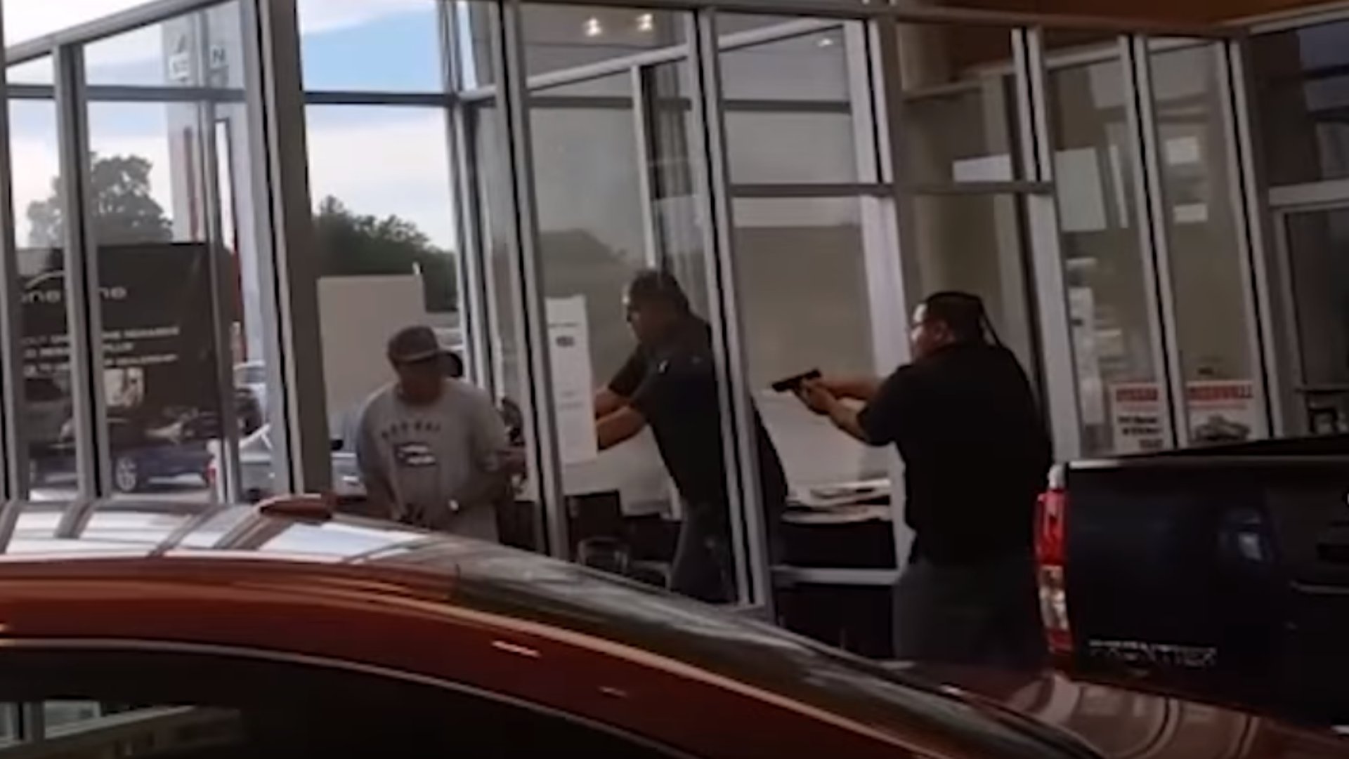 The men waited for over two hours before Hutchinson appeared with the woman around 7:00 in the evening. Video of the moments leading up to the shootout shows the bounty hunters approach Hutchinson with their guns drawn as he sits in a small, glass-walled office with the woman and a Nissan employee. Hutchinson immediately attempts to pull his own gun out of his waistband, but drops it on the desk and all three lunge for it.