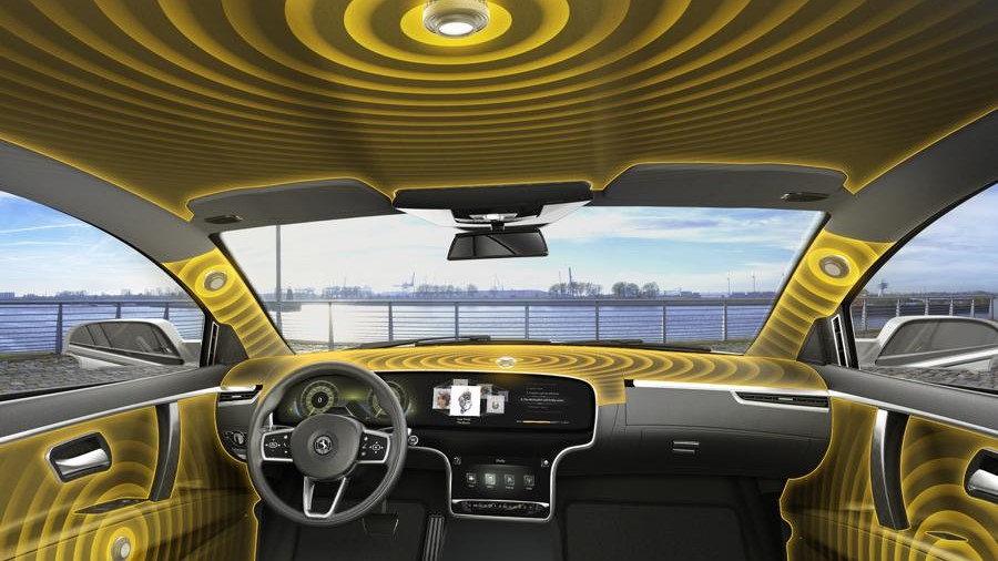 It works by placing actuators throughout the car which create vibrations through the material in your interior, replicating a real speaker. So your A-pillars turn into tweeters, your door panels turn into mid-range speakers, and your roof becomes a subwoofer.