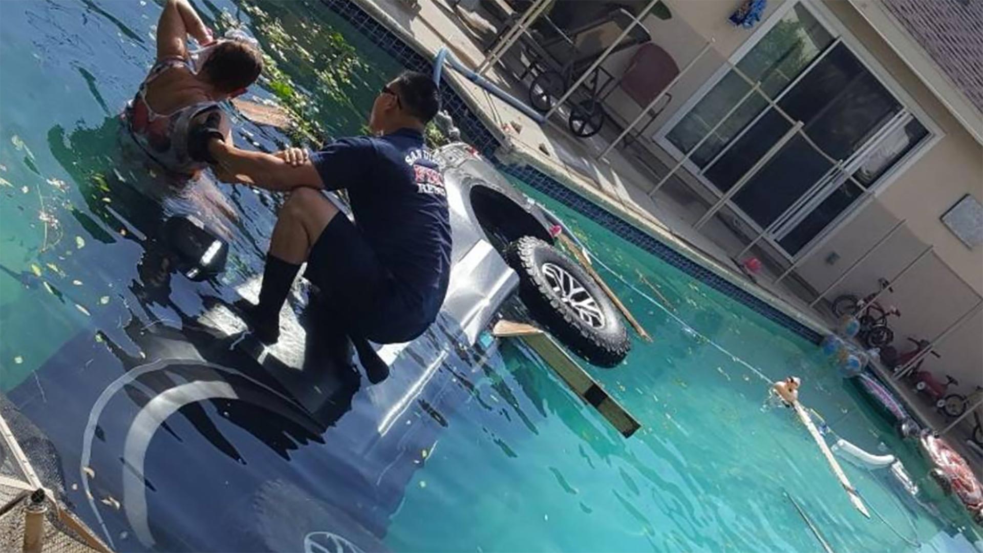 The wife was unable to exit the vehicle and was taken along for the ride of her life. The Ford Raptor barreled through a yard and two fences before ending up in a neighbor’s pool. The Raptor quickly became submerged with the women trapped inside. Gabriel Mejia was working several houses over when he heard the accident. Thinking on his feet, Mejia jumped into the pool, broke the window with a brick and extricated the women.