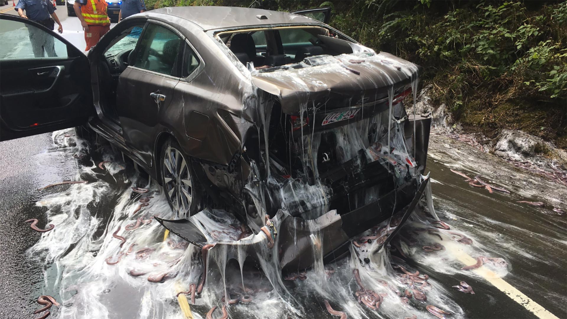 Hagfish, Slime Eels, gooey hotdogs, whatever you want to call these slimy things, they are completely disgusting. If you remember from middle school science hagfish secrete a slime when agitated and apparently a motor vehicle accident counts as agitating them.