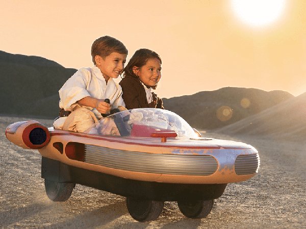 Featuring two forward speeds (2 and 5 mph), a reverse gear, an “interactive” light-up dashboard, seating for two, and sound effects from the actual movie, the Landspeeder is only missing one thing: the ability to hover.