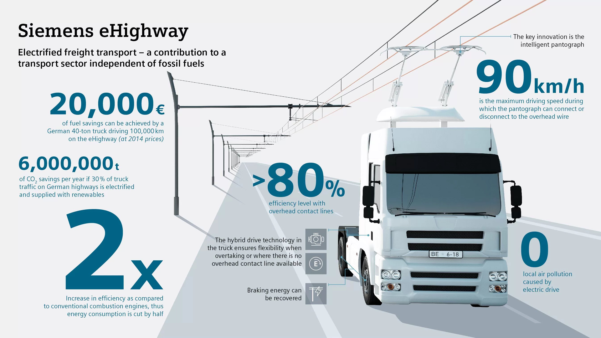 Siemens has been commissioned by the German state of Hesse to build an overhead contact line for electrified freight transport on a ten-kilometer stretch of autobahn. With this field trial, the eHighway will be tested on a public highway in Germany for the first time. The system will be installed on the A5 federal autobahn between the Zeppelinheim/Cargo City Süd interchange at the Frankfurt Airport and the Darmstadt/Weiterstadt interchange.