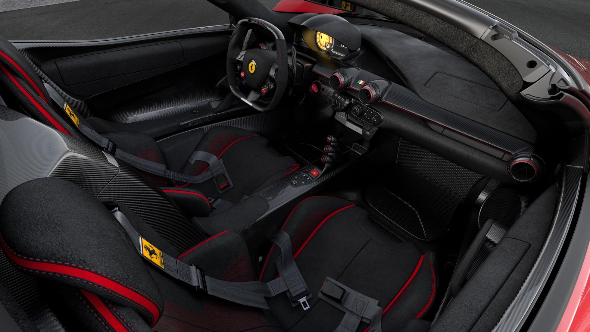 Not only is this LaFerrari Aperta made unique by its production number, but it alo has a one-of-a-kind livery featuring a red Rosso Fuoco body with white Bianco Italia racing stripes. This gives the car a traditional-yet-modern look that’s perfect for celebrating the carmaker’s heritage. The interior is upholstered in black alcantara with red stitching and red leather accents. Onside and out, this LaFerrari looks very Ferrari.