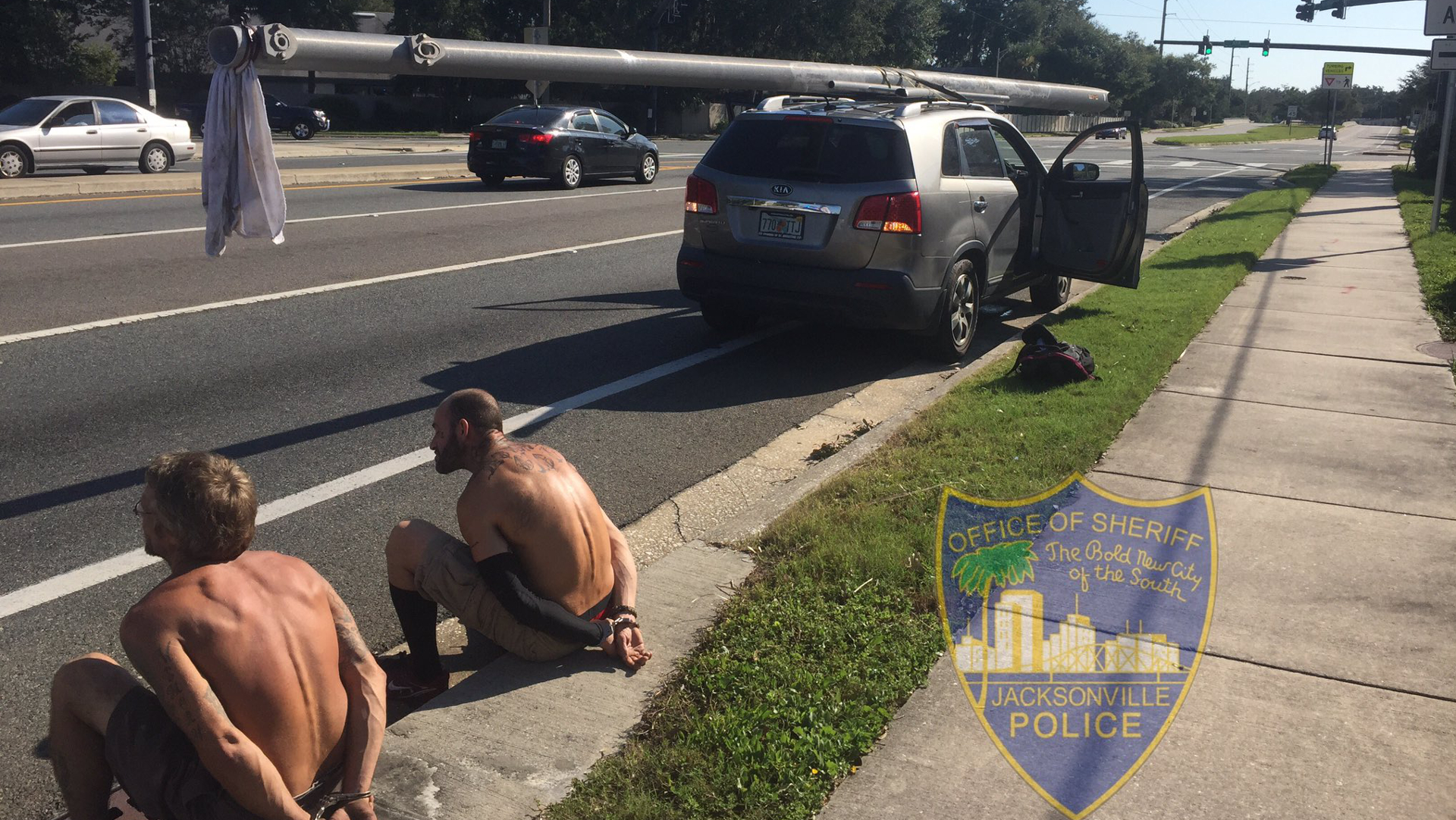 According to WFTV News, an officer received a report from a witness that the two shirtless men were attempting to lift the pole onto the roof of their crossover on Wednesday morning in Jacksonville. As he arrived on scene, he noticed the overloaded Kia trundling away from a very conspicuous empty space on the bridge where the pole used to be.