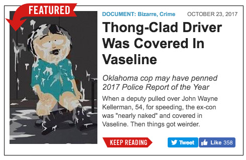 According to the police report, Beebe noticed the man was trembling, and appeared nervous; more unusually, he also noticed a nearly-empty container of Vaseline in the car, and a porno magazine on the seat beside Kellerman. After Beebe asked for identification, Kellerman handed over an Oklahoma ID card with his name on it, according to the report. The deputy then asked if Kellerman had been masturbating; Kellerman said that yes, he had indeed been, shall we say, flogging the dolphin.