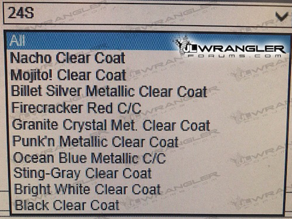 got their hands on another screenshot from an internal Fiat-Chrysler dealer system. This one shows a full list of paint choices for the 2018 Wrangler, doubling the previous confirmed total and giving us a better idea of how the truck will actually look when it hits the streets early next year. According to the screenshot, there are five new clear-coat color choices, four of which are entirely new to Fiat-Chrysler: Nacho, Mojito!, Punk’n Metallic, Ocean Blue Metallic, and Sting-Gray.