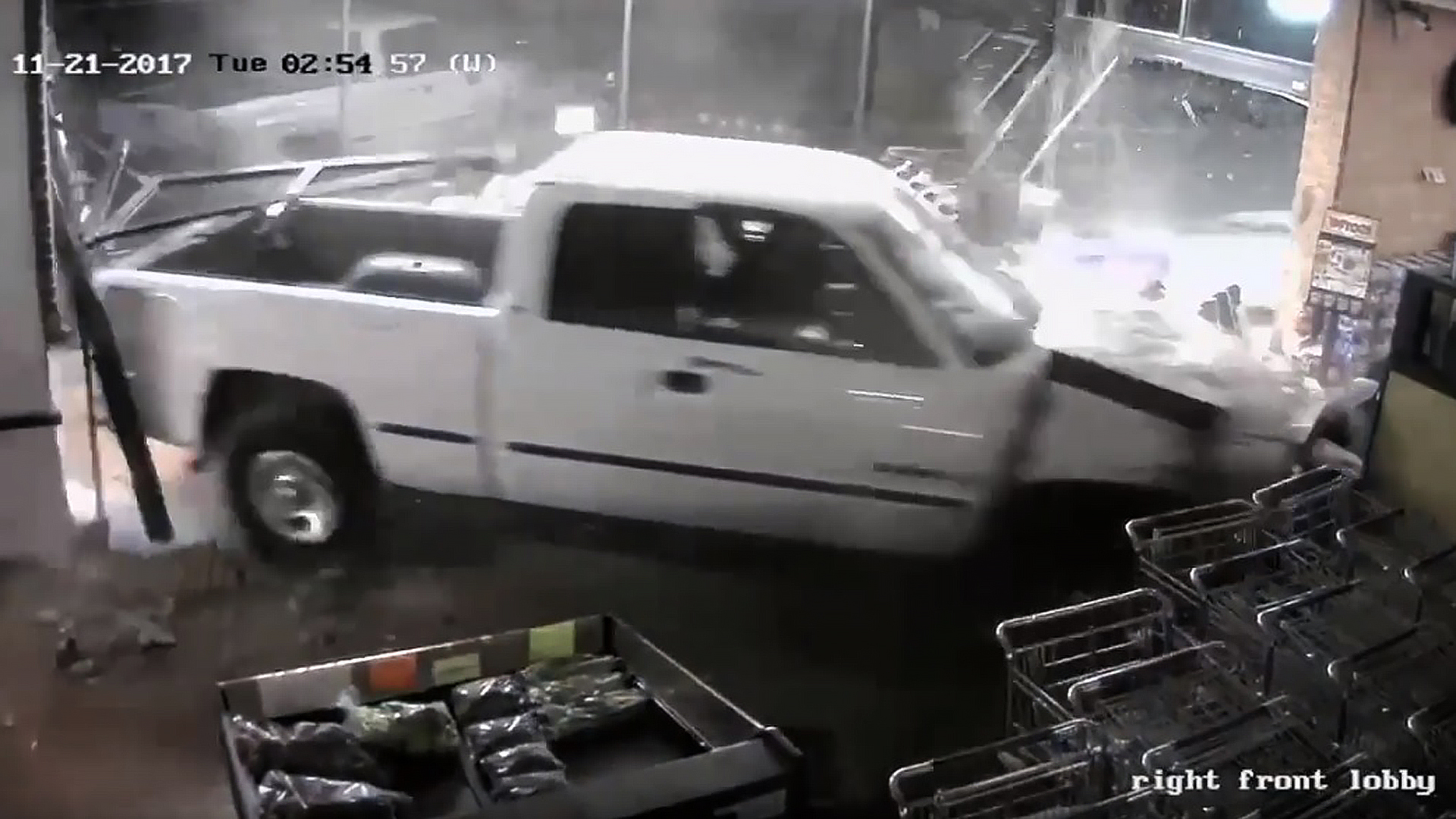 In the footage, two men are seen arriving in a 1999 Dodge Ram 1500 that was previously reported stolen in Georgia. They immediately reverse through one set of sliding doors, but the driver gets stuck as he attempts to make a sharp turn to get further into the store—and presumably, closer to the heavy ATM. After a futile minute, the wheelman pulls the truck around to the other set of doors and rams through head-on, taking out the doors, a good chunk of the brick wall, and the big display of chips and soda. He keeps his foot on the gas, and a second later the entire truck is inside the store.