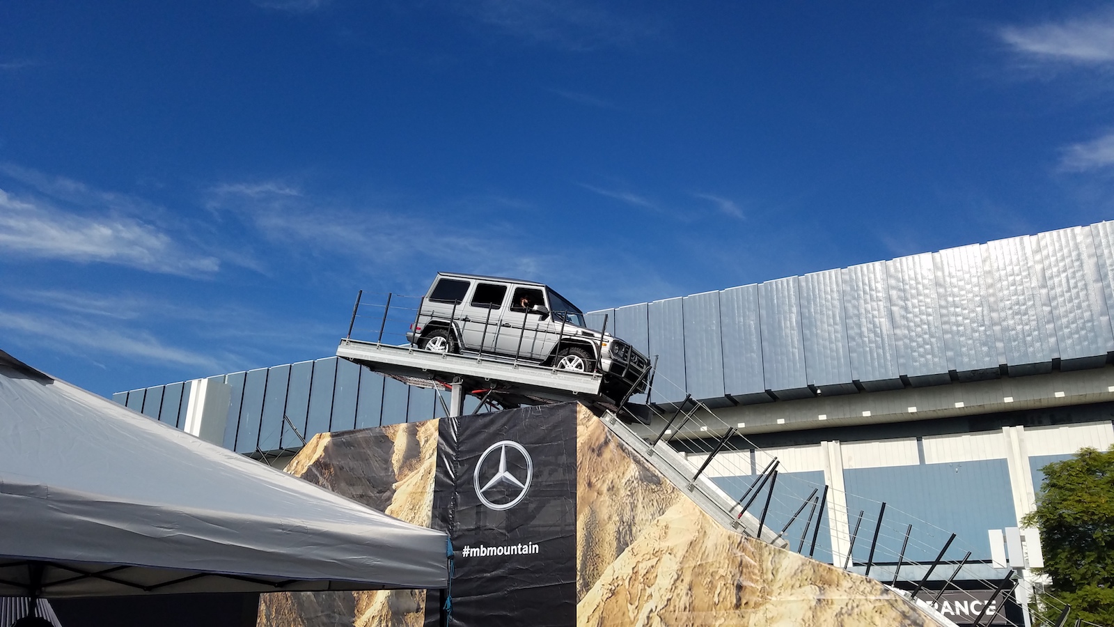 Located outside on the breezeway, the Iron Schöckl or “Iron Shock” activity demonstrates the Mercedes-Benz G550’s impressive all-terrain capabilities. With 416-horsepower, 4-wheel-drive, and three independent locking differentials, the G550 can navigate through, around, and over all sorts of obstacles with ease, as demonstrated here. Passengers ride along as a trained Mercedes driver takes them up and over MB Mountain, planting the car on 45-degree slopes on both the ascent and descent. It feels like a slow rollercoaster–– but it’s still thrilling.