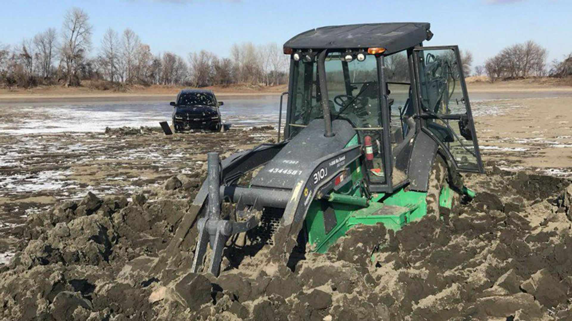 Later that day, the owner of the truck rented a backhoe to try and pull the Silverado out, but the backhoe also broke through the ice, and is even more entombed in frozen mud as of last report.