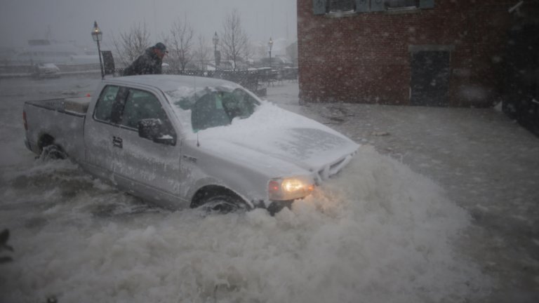 Thursday’s “nor’easter” snowstorm brought another type of Perfect Storm to Gloucester, Massachusetts. A combination of high winds, high tides, and low barometric pressure caused a storm surge that resulted in flooding all up and down the coastline. Residents of Gloucester who obeyed a street parking ban soon found pictures on Twitter of their cars flooded up to their hoods.