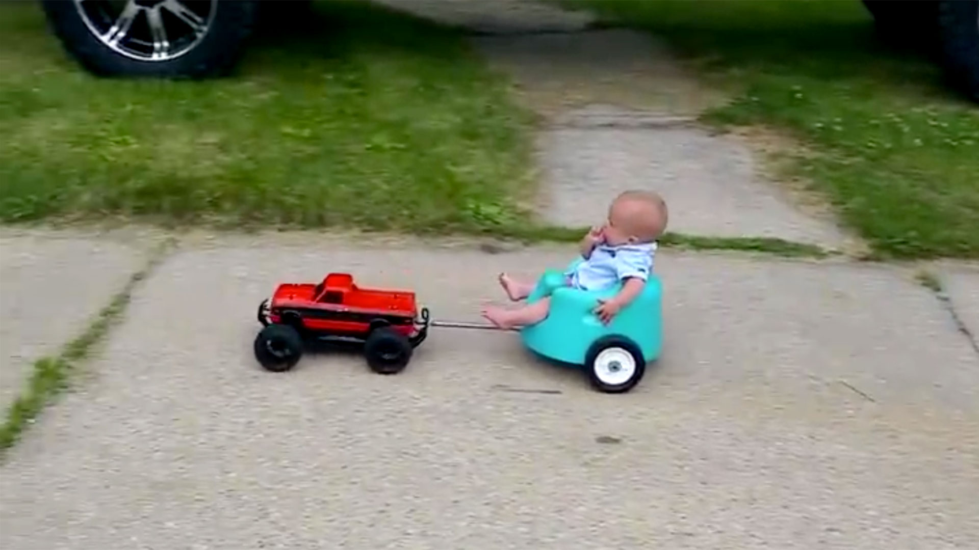Slapping wheels onto his kid’s Bumbo, then hitching the seat via a metal rod to an RC car, a father turns an otherwise stationary object into an infant’s chariot. Weaving around the old man’s Chevy Trailblazer SS and under his lifted Chevy Silverado 2500 Duramax, the baby seems pretty content with the whole operation. We are curious to see what this clever parent cooks up next for his young Knievel.